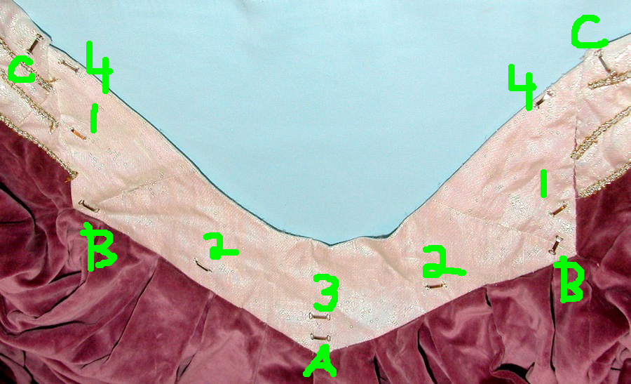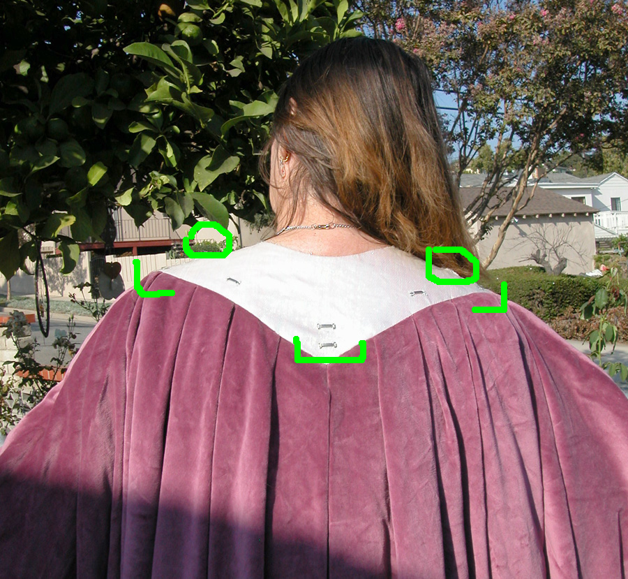 Half boxes are the hooks for the quilted collar. Small circles are the