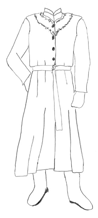 helps on his costume. Med shot, in his leather?/ suede? coat/jerkin?. Does