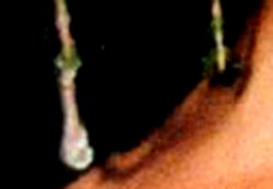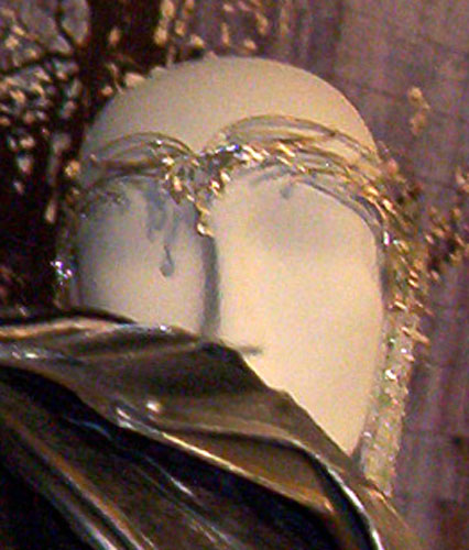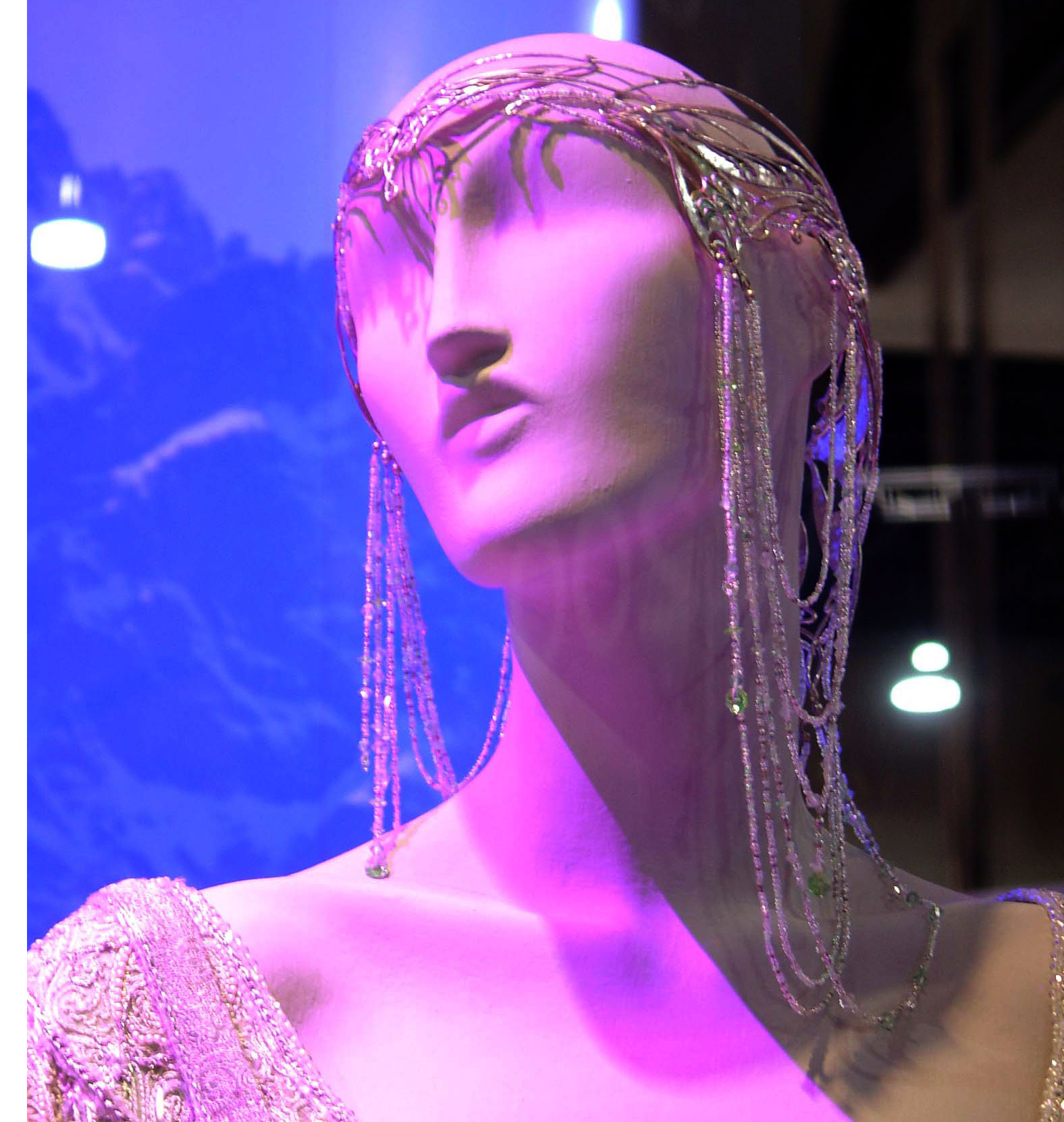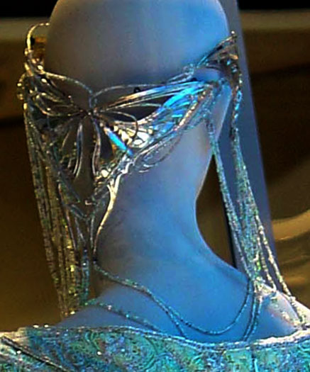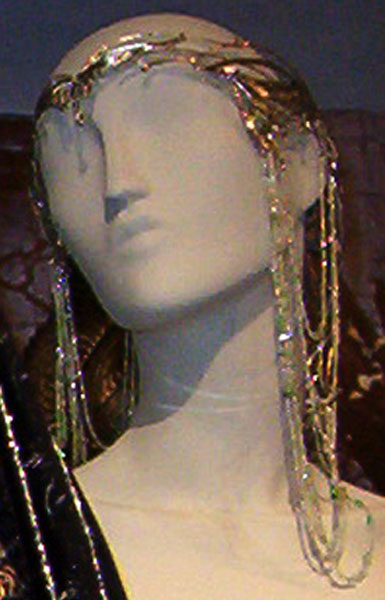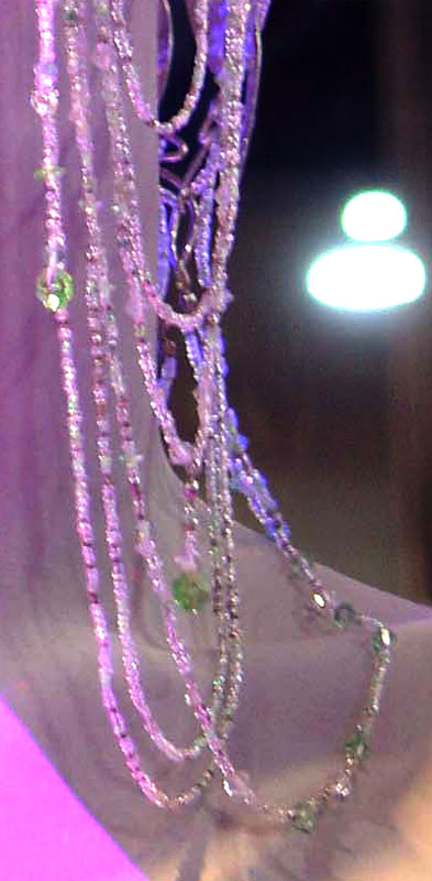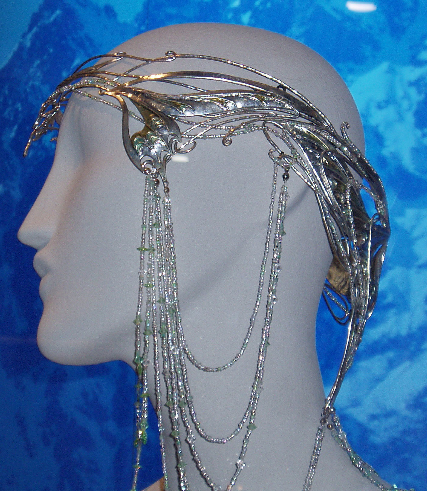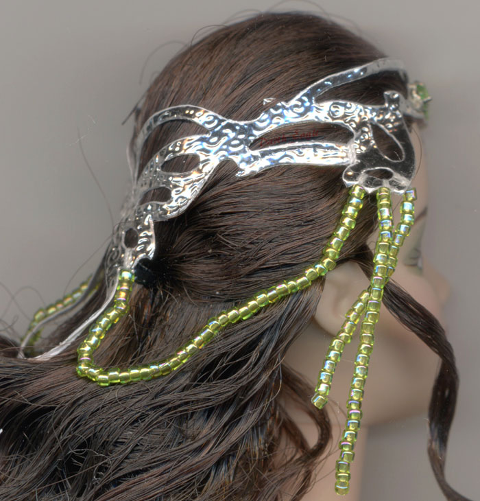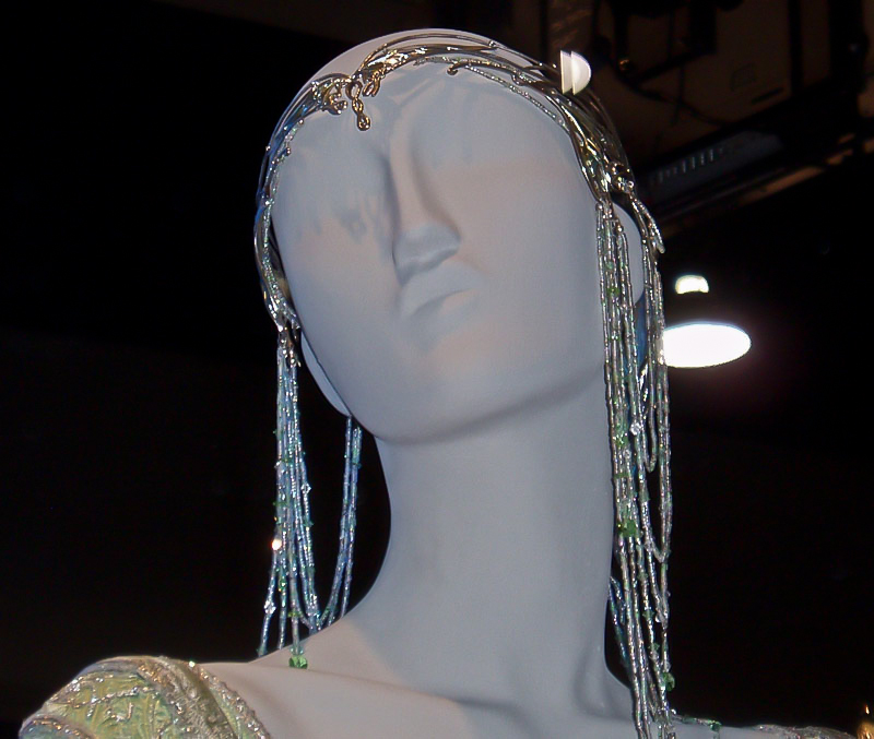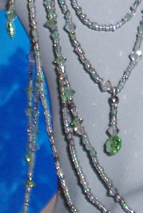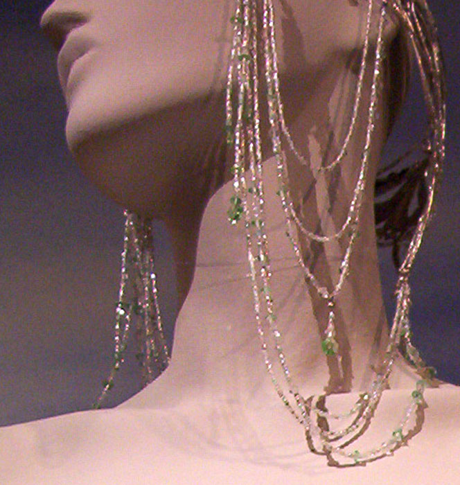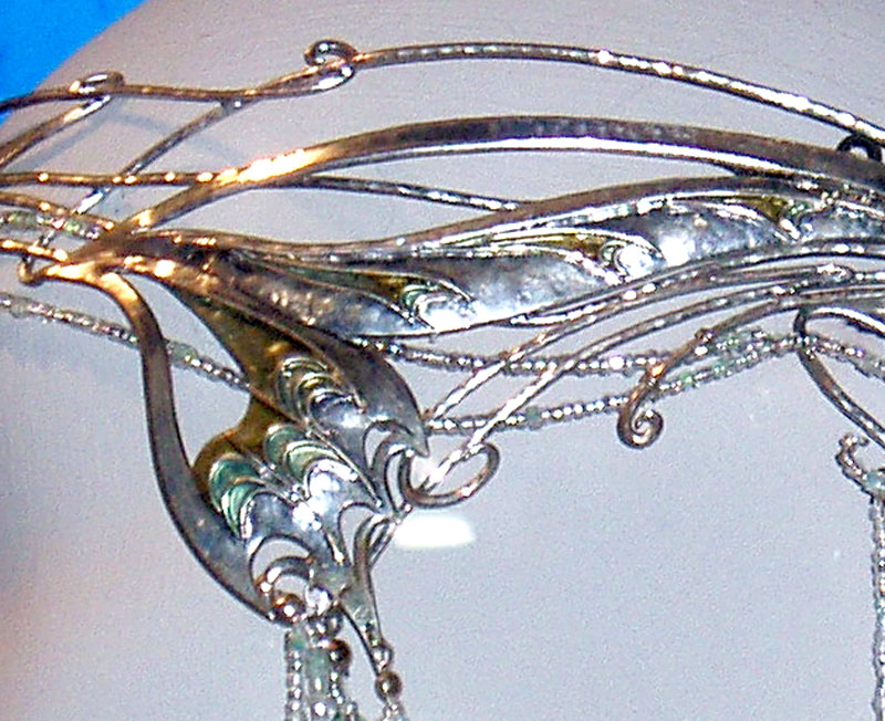 | CU of the jeweled droplets off the edge of her crown. Silver chain with green crystal inserted in the chain and ending in crystal teardrops. |