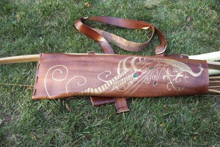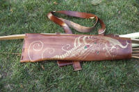 I constructed my Lothlorien quiver using 7-8oz. veggie tanned leather. Before hacking into my leather I made a “mold” out of cardboard and duct tape, and fitted cheapo vinyl around it to get a template. Using my template, I cut the sized piece from the hide and dyed it using Fiebrings Leather Dye. I then took my peacock design that I had drawn onto tracing paper and tooled it into the wet leather using a stylus. The leather was then tied onto the mold while it was still wet and left to dry for 24 hours. I did all the trimming, hole punching, and painting (Cova Color paints) while the quiver was still on the mold. Then I sewed up the back and the bottom with leather strips. More in her scrapbook entry == Lasgalen Bow commentsReplacement for the metal around the edges on the MirkwoodUse Magic Sculpt. It is a two part clay-like mixture that will give you about an hour working time before it becomes as hard as a rock. Available at hobby shops. == Tammy Dying the Mirkwood BowWhen the wood was dry, you could stain it black and paint on the goldwork for the Mirkwood bow. Black wood stains can be hard to come by, but I've had great success (as an adult, on weapon handles) using calligrapher's ink, coated 3 times in acryllic spray (gloss or matte) finish afterwards to keep it from bleeding onto anything. ==azelana I use black leather dye on wood...and then seal it with the normal leather sealant. == Tammy Raised designs on the bowI used magic sculpt, sculpted the designs on the quiver and then painted