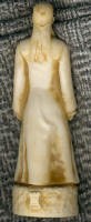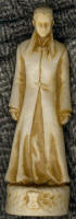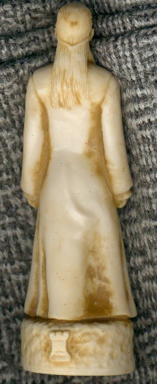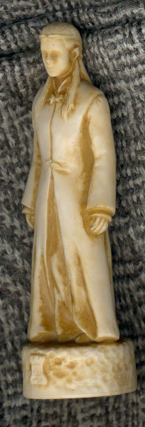 Legolas is with the elven delegation at Aragorn's coronation. He wears full length formal robes. The outer robe is made from an intricate brocade with a pale blue background. There is a rich mix of greens, blues, yellows, golds. Very extreme high collar that comes to a point in the front. This is a standard set in collar. Set in long sleeves. Slight bell to the sleeves. Long Elrond style robe, fitted with just a slight flare. No slits are visible. The front has a bit of a petal look at the front hem. Lined in cream silk with a bit of a crinkle texture. Underlayer also has a high collar. This is also a robe, same pattern but tighter sleeves. Hem is about an inch shorter. Sleeves are tight fitting and just a tad longer, slightly longer than the wrists. The underlayer has a wide (4-5") belt, much like Elrond's, and Arwen's Farwell dress. This includes two long tails and an elven design in white on the outer tail. Under both robes he has light blue trousers. The "boots" look like his standard boots of short boots and wrap. However, they may be a silver-grey version of them. He wears a small circlet of silver. The clasp at his neck looks like the silver stylized butterfly at center of his belt from the hero fellowship shirt. Different hair style. No braid in front. Just small amounts of hair are pulled back and braided into one herring bone braid at the back of his head.