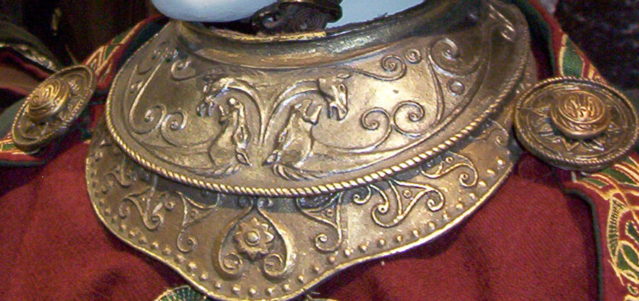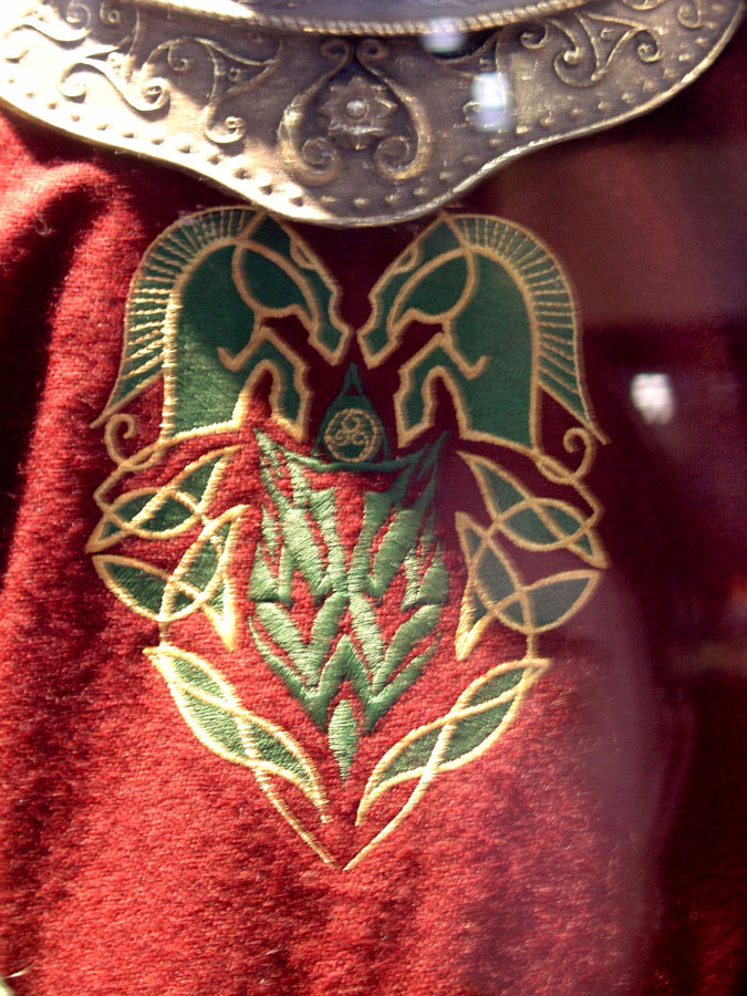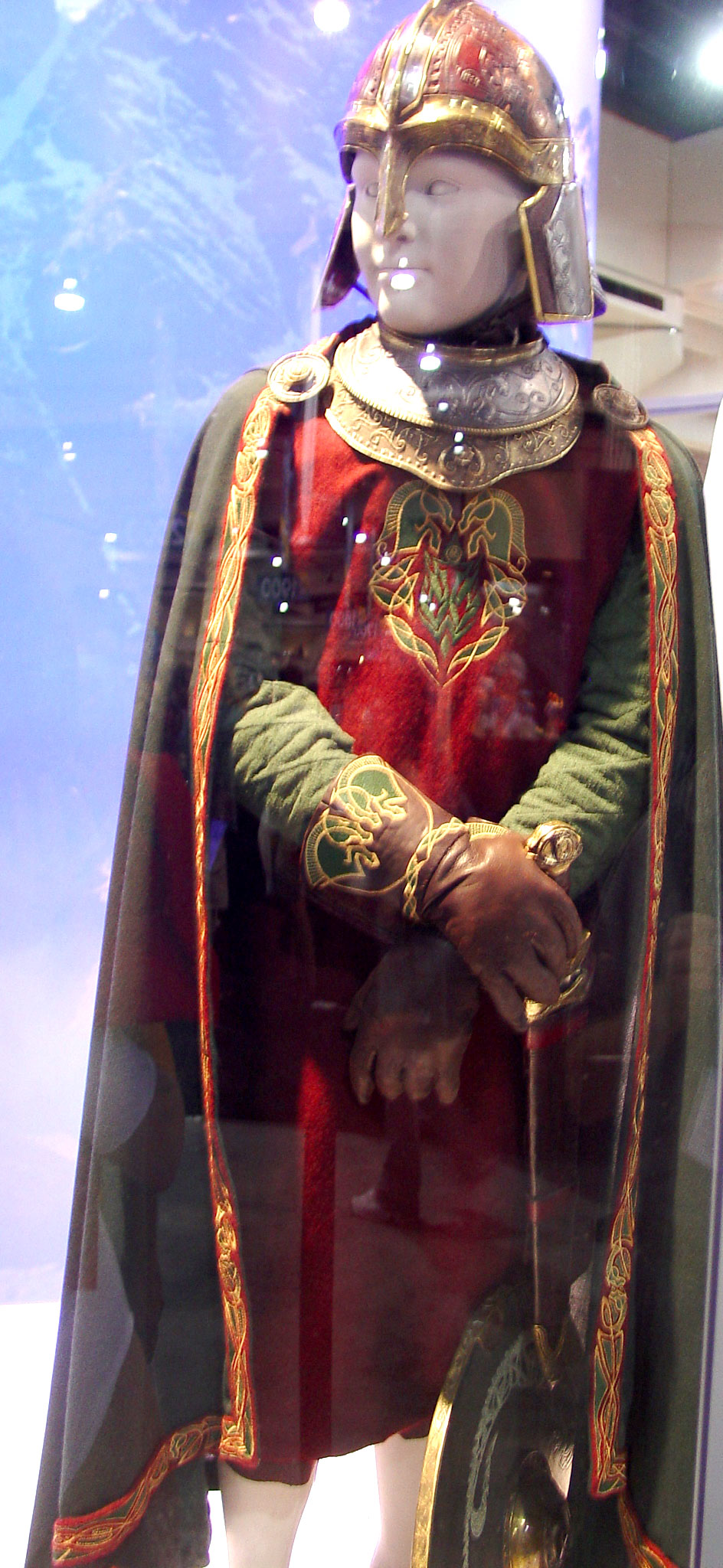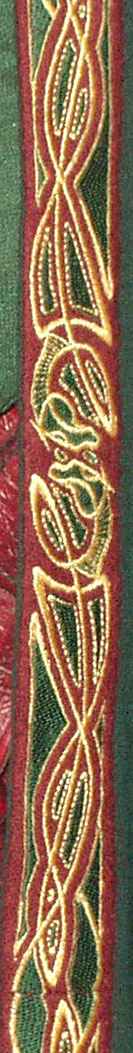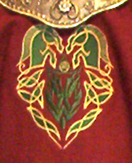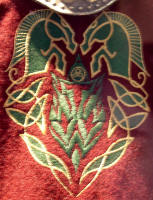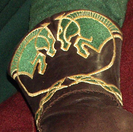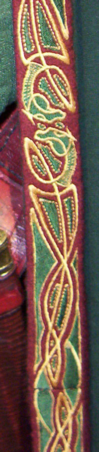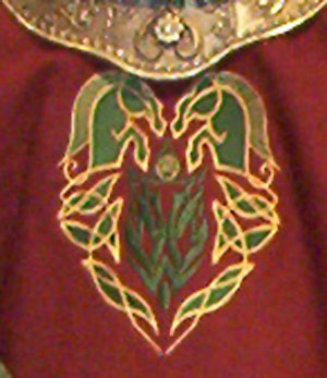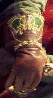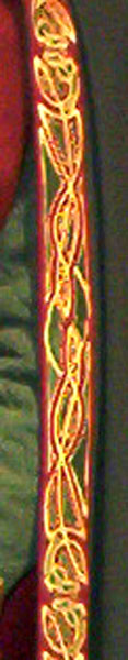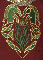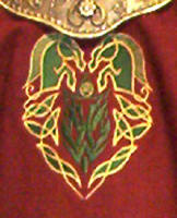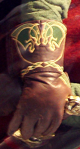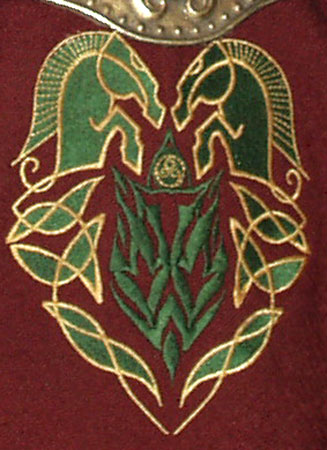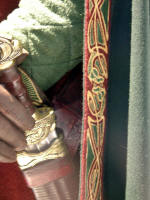 Made of bronze covered in tooled and red painted leather in the same general style as Eomer, Theoden, or Dernhelm. It appears to be one plate though stitched together from 4 or 5 (or more) segments: a chest panel, a thinner panel, two stomach panels of different widths, and then a thin bottom panel. The top section has a seam down the center. (MIGHT be an actual opening that is laced shut, but that's very iffy.) Across the middle is a band about 2 inches or so wide. The lower section is 2 or 3 horizontal segments, probably not articulated. The bottom is flared outwards and comes to a slight point (downwards) at the center front.(you can see what I mean on The Two Towers DVD Behind the Scenes look at ROTK when Dom is talking to PJ.) The photo with Pippin shows a bottom edge which is indented upwards in the middle, similar to a concept sketch in The Art of the Two Towers, but this must be Merry's vambrace or something else. The seams of each panel are rounded upwards. In the more recent picture of Merry and Pippin you can see that the indeterminate design on the stomach panel actually stretches slightly over two separate panels, though most of the design (that is raised a little and appears to be some kind of crest) is primarily on the stomach (third) panel. The top edge is curved upwards and has a band of metallic decoration across it. I believe this band simply stops at the edges of the arm openings. A roughly octagonal decorated medallion (brass?) which seems to be two horse heads facing away in opposite directions is riveted to the center of the top edge. Two heavy leather bands, about 3 to 3-1/2 inches wide and undecorated, go from the top edge (presumably stitched to the back of it) over the shoulders. They may continue down the back, perhaps joined to a belt of some sort around the waist. But again, in the concept art the cuirass goes all the way around the torso and laces shut at the left side, so something like that is a possibility. The sides and bottom of the cuirass are obscured, unfortunately. BALDRICOver the right shoulder and crossing the chest is a wide red leather baldric which presumably supports the sword scabbard. It is two layers, the bottom about 2-1/2 inches wide with a stitch line along both edges, the upper being half an inch narrower and decorated with tooled and painted designs of men on horseback (at least four). At the top end is a narrower part, under 2 inches wide, which seems to be stitched under the end of the upper layer, with a sort of Gothic-arch-shaped medallion at the juncture. Just above that is the buckle, figure-8 shaped with a raised design, identical to this: http://www.alleycatscratch.com/lotr/Human/Rohan/Armor/rohanbelt11_kl.jpg The problem is that the buckle's tongue is pointing upwards, so the end of the baldric MUST be pointing downwards. If so, is it NOT stitched between the baldric layers but tucked into a slot of some sort? Is the pointed medallion a strap end, folded back on itself? Pattern: the belt is tooled with scenes of the king marching with his army - cavalry, foot soldiers, horse archers, even hunting dogs - set in panels the entire length. VAMBRACES