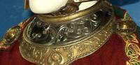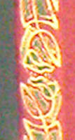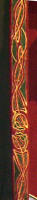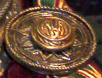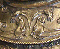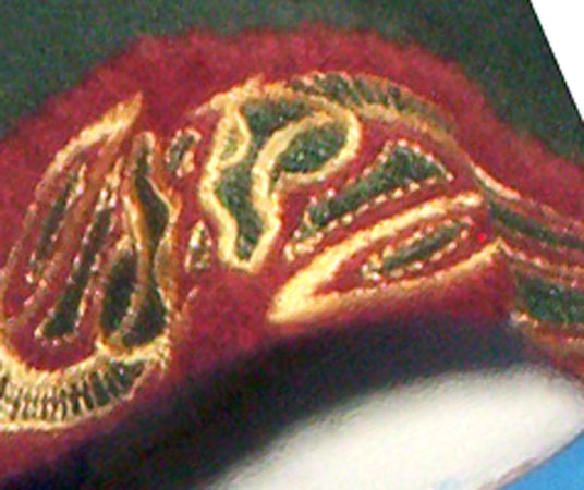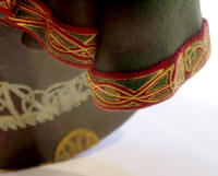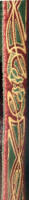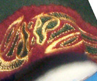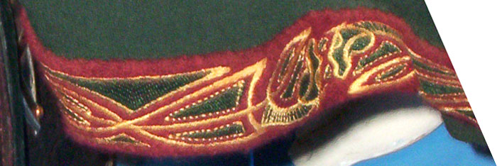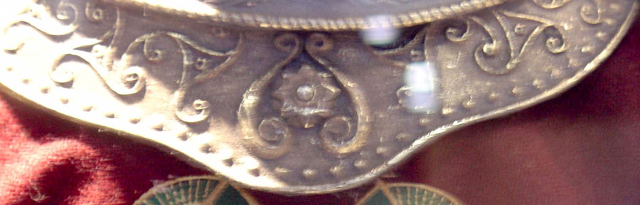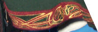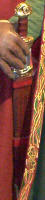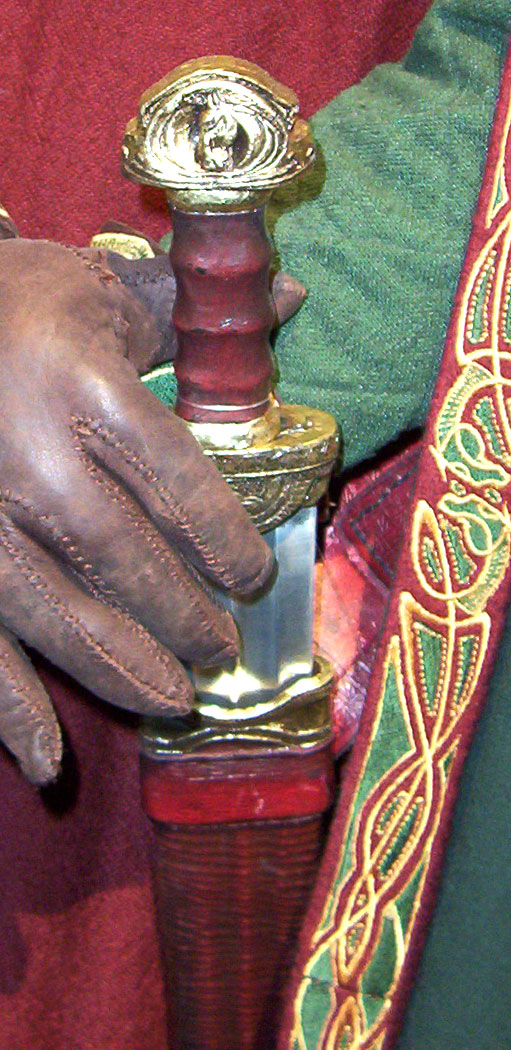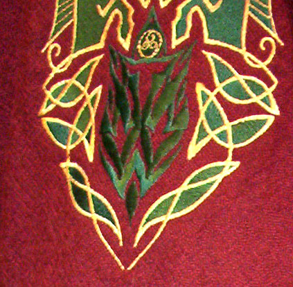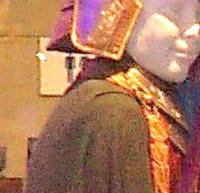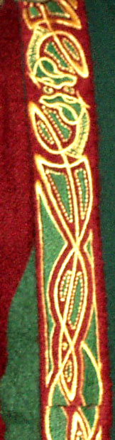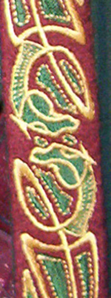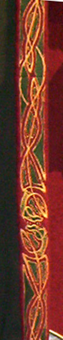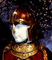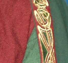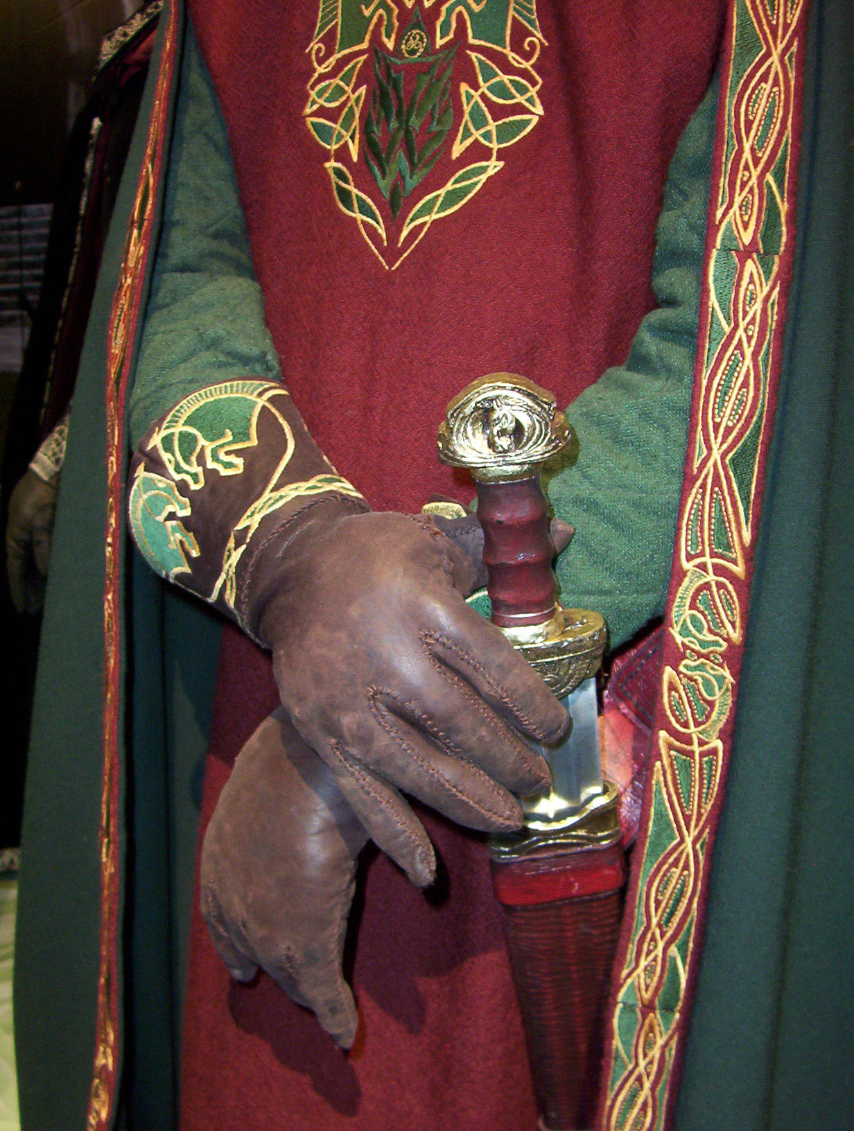 Made of bronze covered in tooled and red painted leather in the same general style as Eomer, Theoden, or Dernhelm. It appears to be one plate though stitched together from 4 or 5 (or more) segments: a chest panel, a thinner panel, two stomach panels of different widths, and then a thin bottom panel. The top section has a seam down the center. (MIGHT be an actual opening that is laced shut, but that's very iffy.) Across the middle is a band about 2 inches or so wide. The lower section is 2 or 3 horizontal segments, probably not articulated. The bottom is flared outwards and comes to a slight point (downwards) at the center front.(you can see what I mean on The Two Towers DVD Behind the Scenes look at ROTK when Dom is talking to PJ.) The photo with Pippin shows a bottom edge which is indented upwards in the middle, similar to a concept sketch in The Art of the Two Towers, but this must be Merry's vambrace or something else. The seams of each panel are rounded upwards. In the more recent picture of Merry and Pippin you can see that the indeterminate design on the stomach panel actually stretches slightly over two separate panels, though most of the design (that is raised a little and appears to be some kind of crest) is primarily on the stomach (third) panel. The top edge is curved upwards and has a band of metallic decoration across it. I believe this band simply stops at the edges of the arm openings. A roughly octagonal decorated medallion (brass?) which seems to be two horse heads facing away in opposite directions is riveted to the center of the top edge. Two heavy leather bands, about 3 to 3-1/2 inches wide and undecorated, go from the top edge (presumably stitched to the back of it) over the shoulders. They may continue down the back, perhaps joined to a belt of some sort around the waist. But again, in the concept art the cuirass goes all the way around the torso and laces shut at the left side, so something like that is a possibility. The sides and bottom of the cuirass are obscured, unfortunately. BALDRICOver the right shoulder and crossing the chest is a wide red leather baldric which presumably supports the sword scabbard. It is two layers, the bottom about 2-1/2 inches wide with a stitch line along both edges, the upper being half an inch narrower and decorated with tooled and painted designs of men on horseback (at least four). At the top end is a narrower part, under 2 inches wide, which seems to be stitched under the end of the upper layer, with a sort of Gothic-arch-shaped medallion at the juncture. Just above that is the buckle, figure-8 shaped with a raised design, identical to this: http://www.alleycatscratch.com/lotr/Human/Rohan/Armor/rohanbelt11_kl.jpg The problem is that the buckle's tongue is pointing upwards, so the end of the baldric MUST be pointing downwards. If so, is it NOT stitched between the baldric layers but tucked into a slot of some sort? Is the pointed medallion a strap end, folded back on itself? Pattern: the belt is tooled with scenes of the king marching with his army - cavalry, foot soldiers, horse archers, even hunting dogs - set in panels the entire length. VAMBRACES