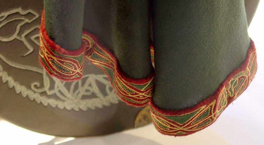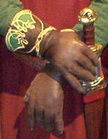Tooled and painted leather, like the armor. Could actually be done in layers with openwork on top, since the front edge shows 2 layers. A fairly simple pointed shape overall, probably buckled but the inner side is not visible. A tooled band of red leather forms a border along the back edge. A brass medallion similar to the one on the breastplate is at the point of each vambrace. The hands are covered by gloves of thin dark leather, no way to tell if they are connected to the vambraces or not.