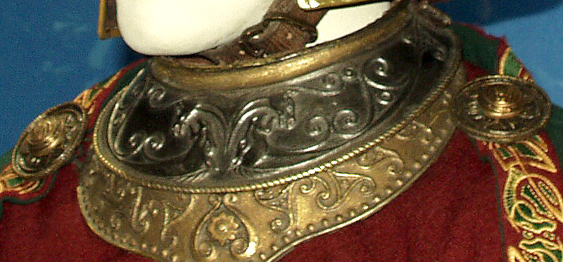 DescriptionHis arms are covered by grey wool sleeves, (which being the wrong color as well as darn awkward to wear with armor probably is not his regular frock coat) and over these there are apparently short sleeves of nearly the same color or a shade darker. He seems to be wearing his usual breeches, and no mail or other armor can be seen covering his legs at all. CUIRASS or BREASTPLATE