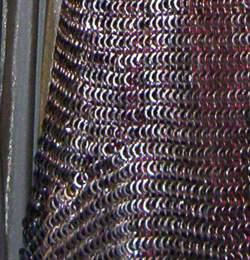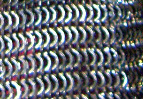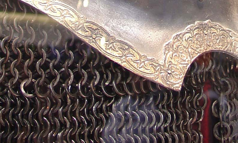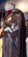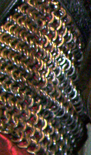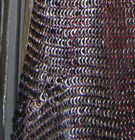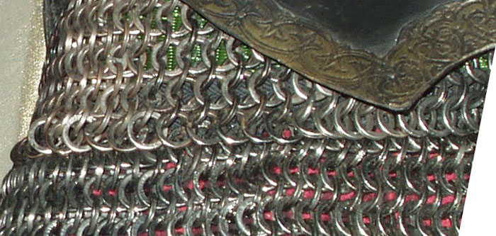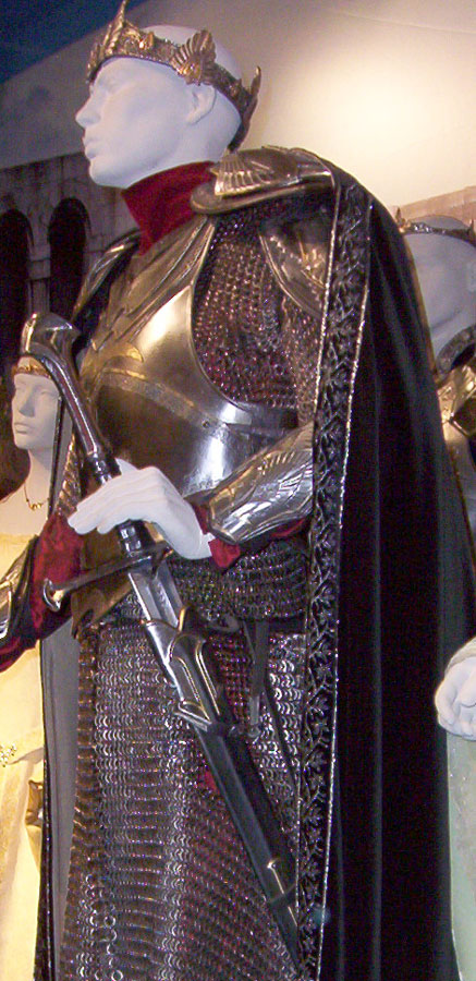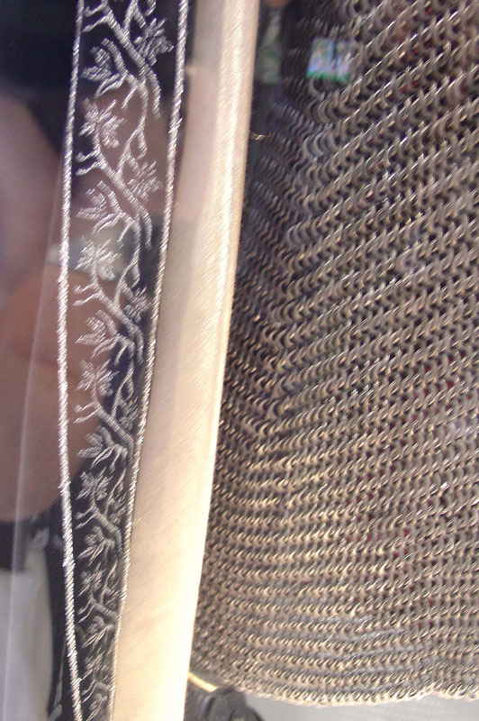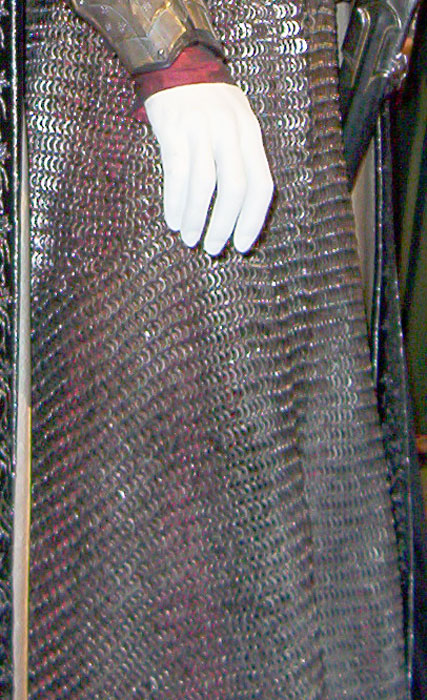 Aragorn's Coronation Maille ShirtWorn in ROTK. Interestingly, in close up at exhibit it looks like there is a break at the waist - movie magic again??? This is worn with Aragorn's Coronation outfit... but it is probably the same one worn with his black gate armor. The main shirt is standard 4 in 1. It's sleeves go down to the elbow. The front, low calf length. It is split front and back almost all the way up to the armor chest plate. The sleeves are standard squared on. (Note how the side of the hem drip, that's the indicator.) There are gores added in the side. The back appears to be longer than the front. It is also split. all the way up. On looking at the armor close up, it looks like there's a bit of "movie magic" at work. There appears to be a break at the waist and some stabilizing threads of bright green...