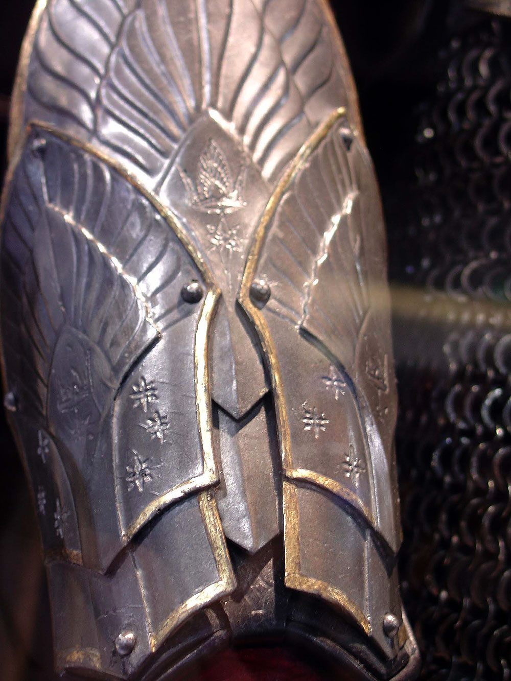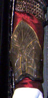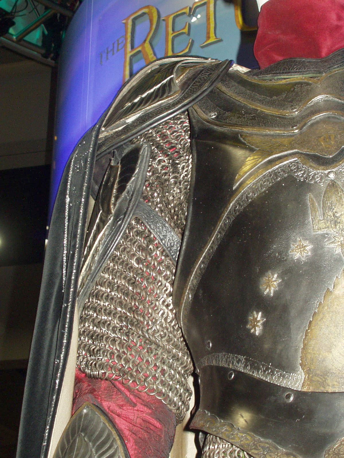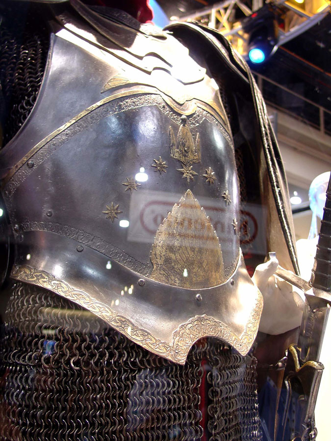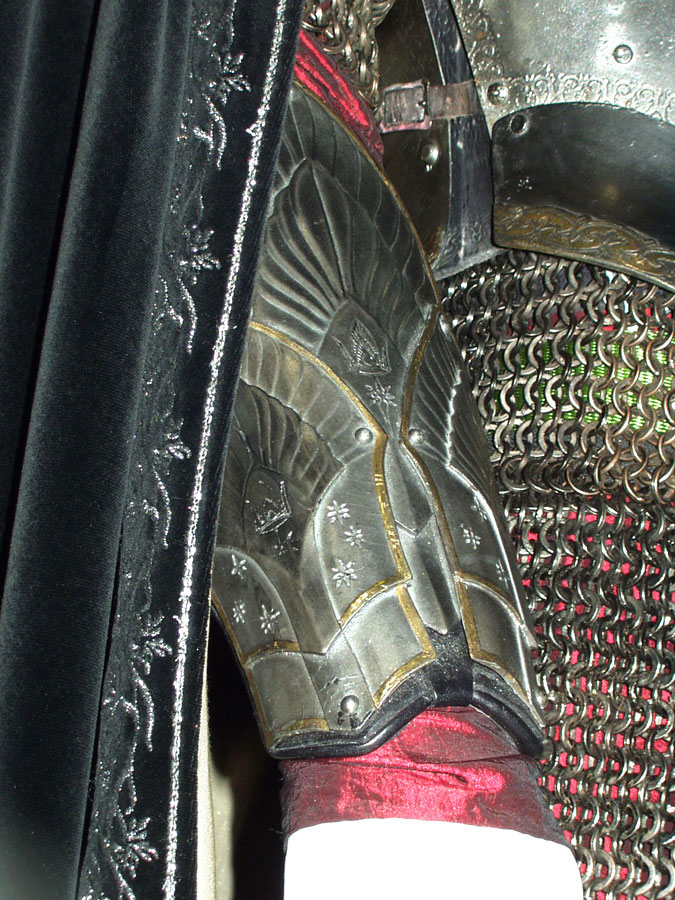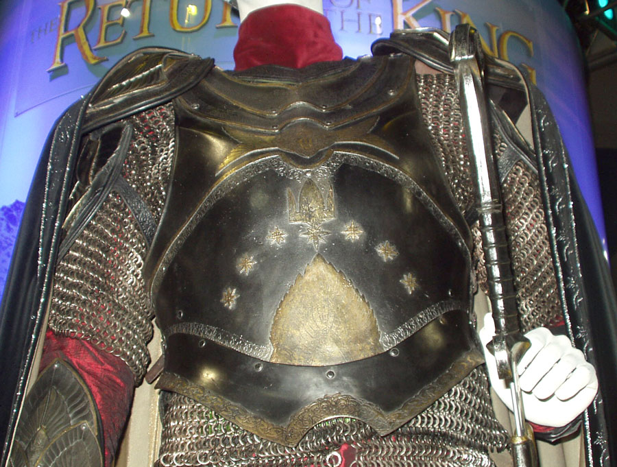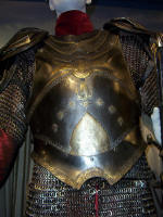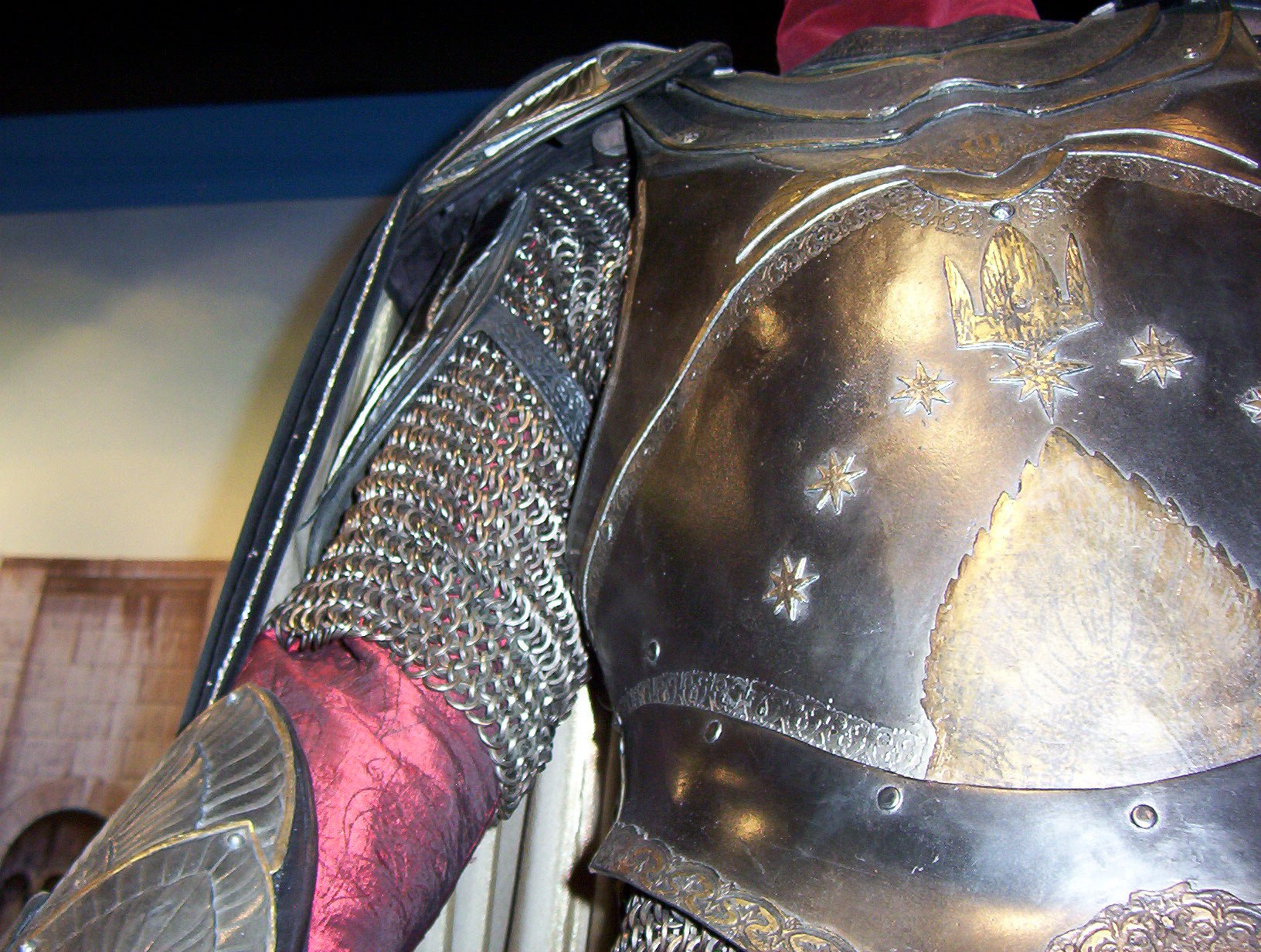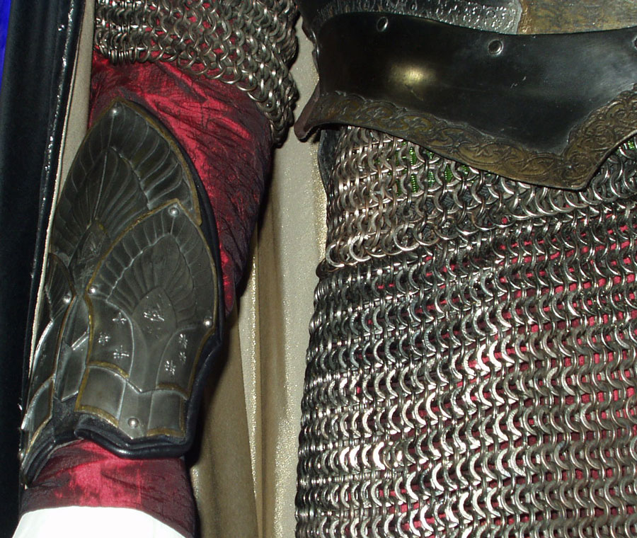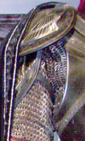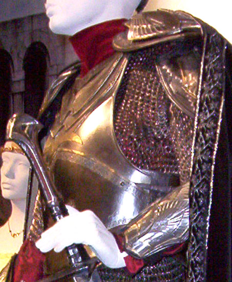 | Here he wears full length chain mail, split in the center. Note is is longer in back and comes to a point. | Chest armor detail. (For actual detail check Isuldor) |