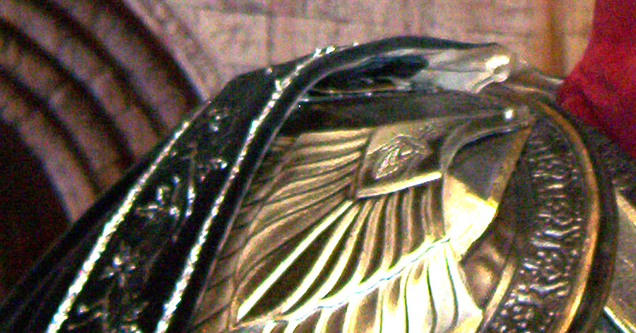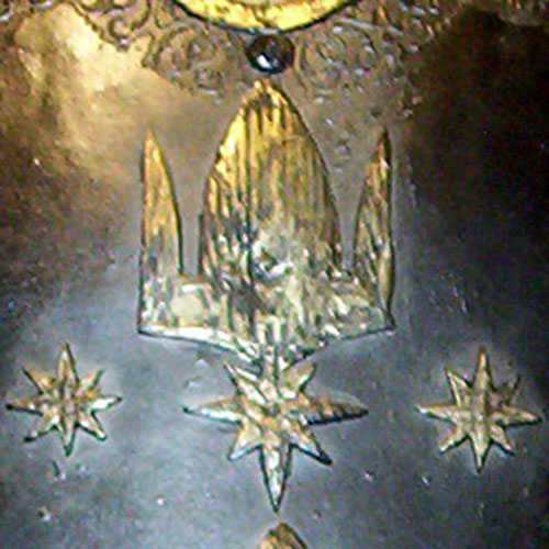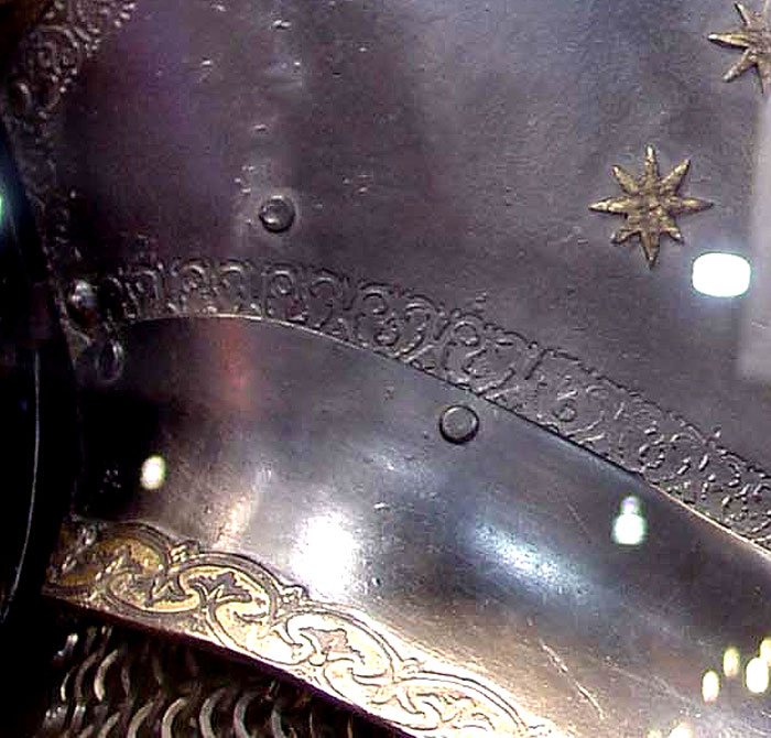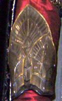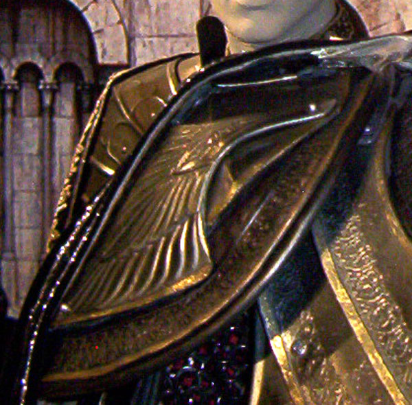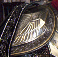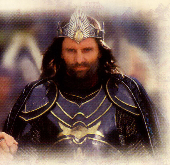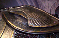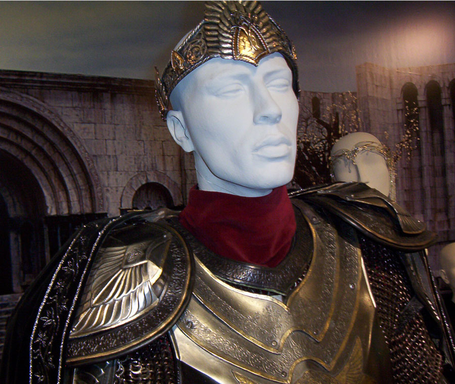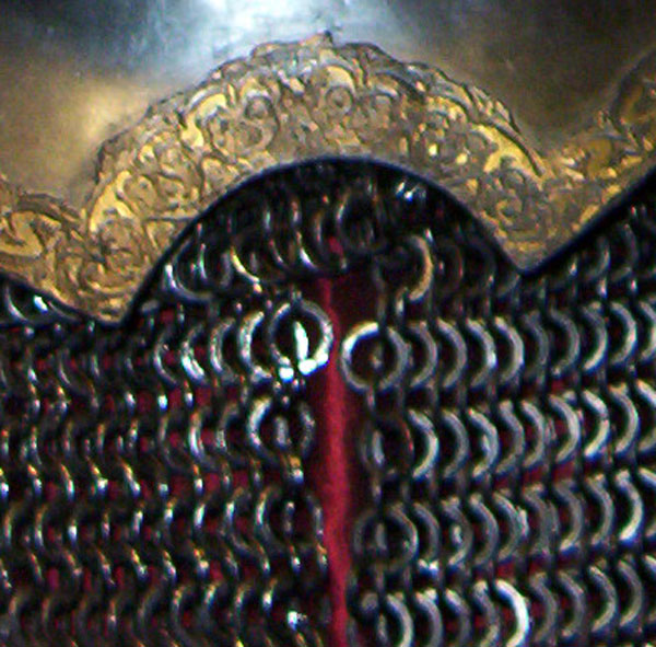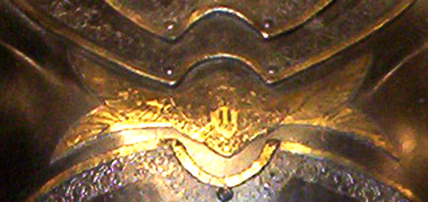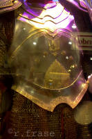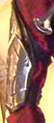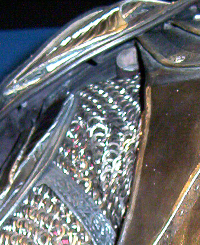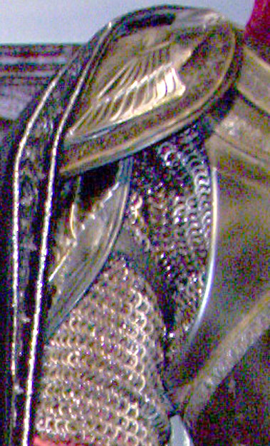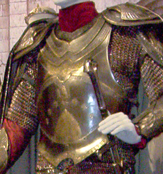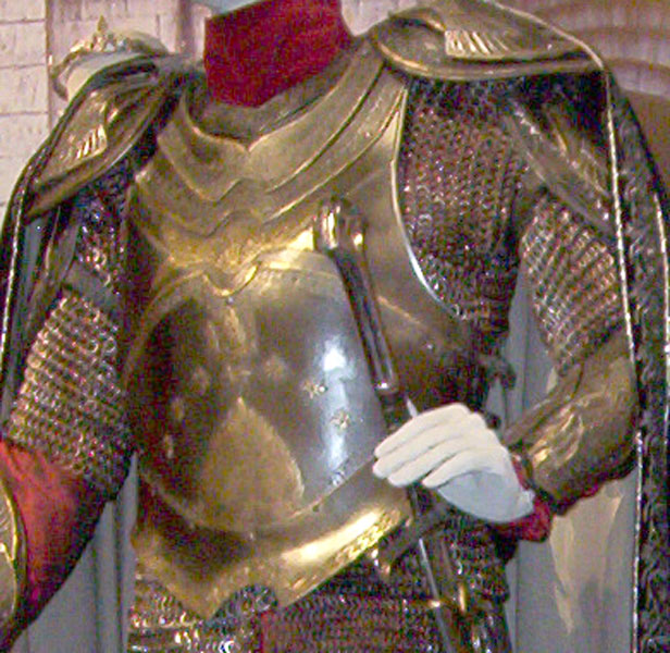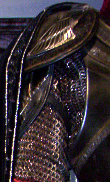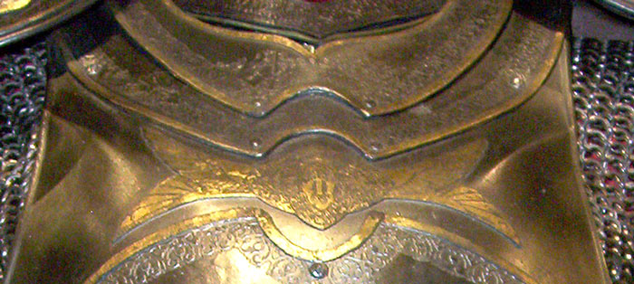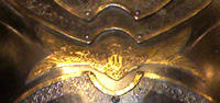 | Here he wears full length chain mail, split in the center. Note is is longer in back and comes to a point. | Chest armor detail. (For actual detail check Isuldor) |