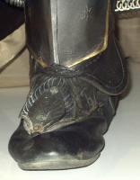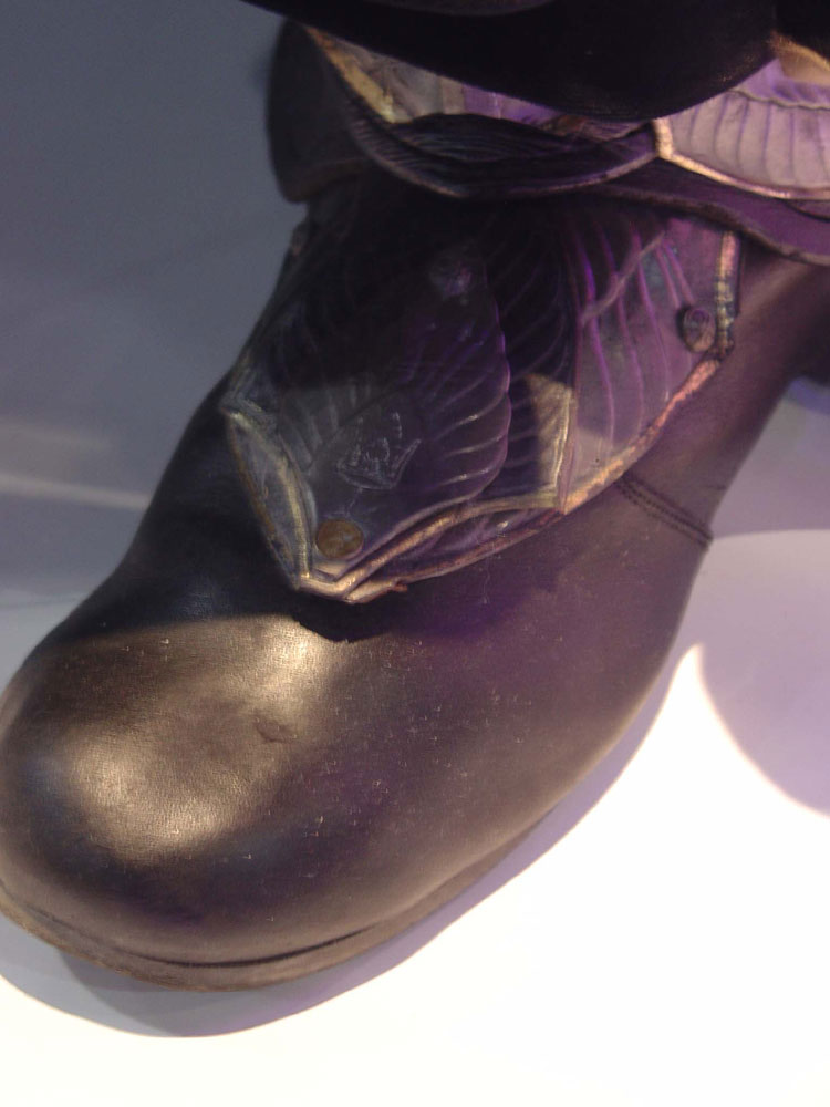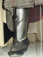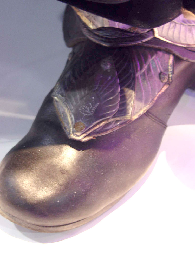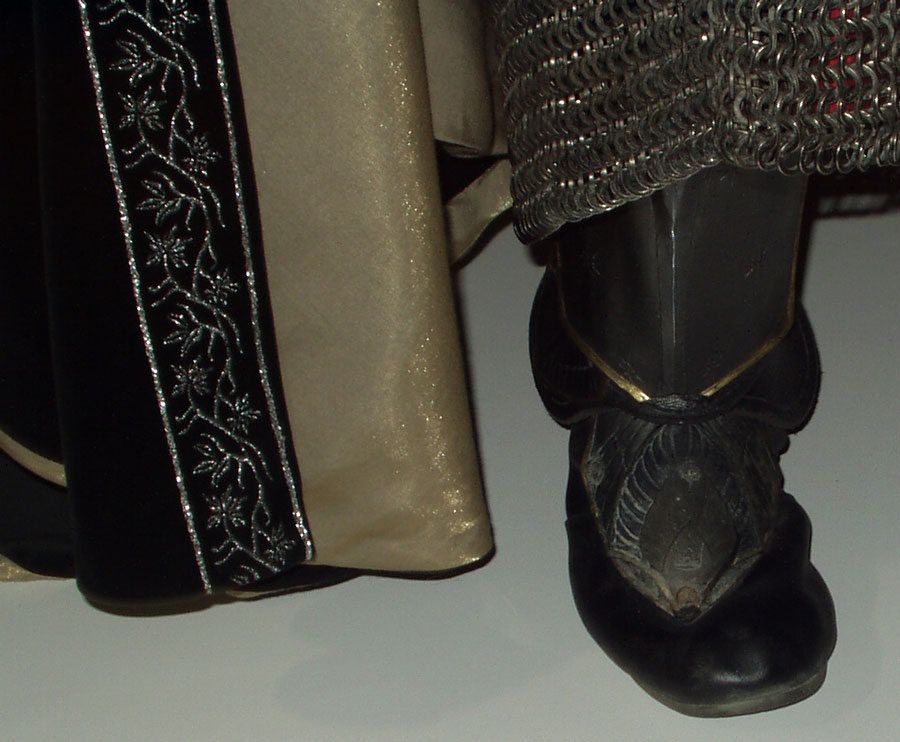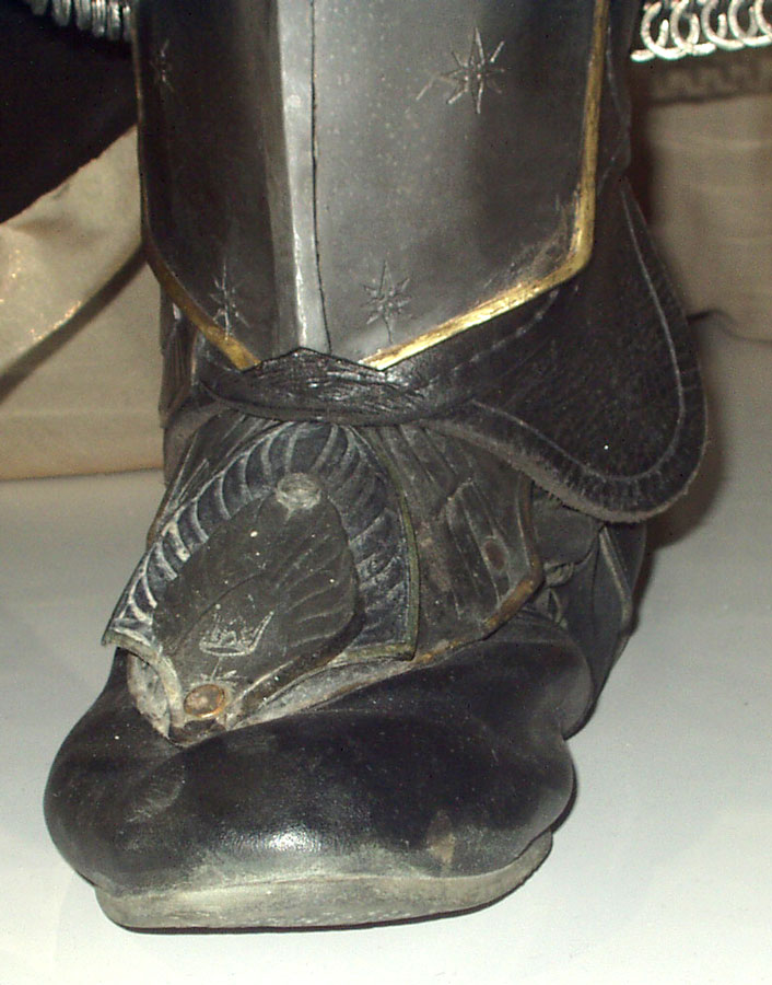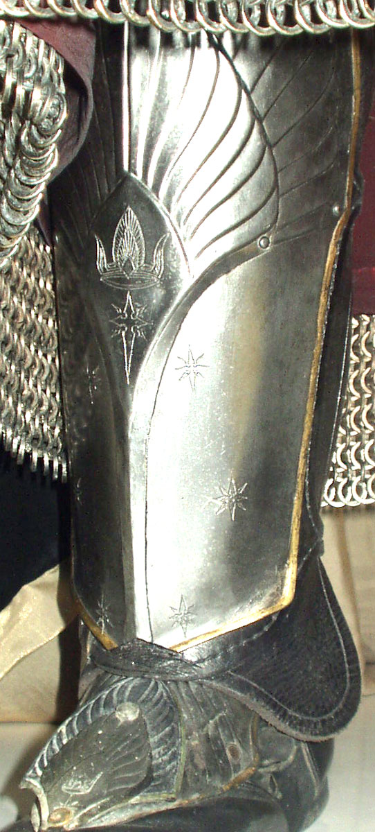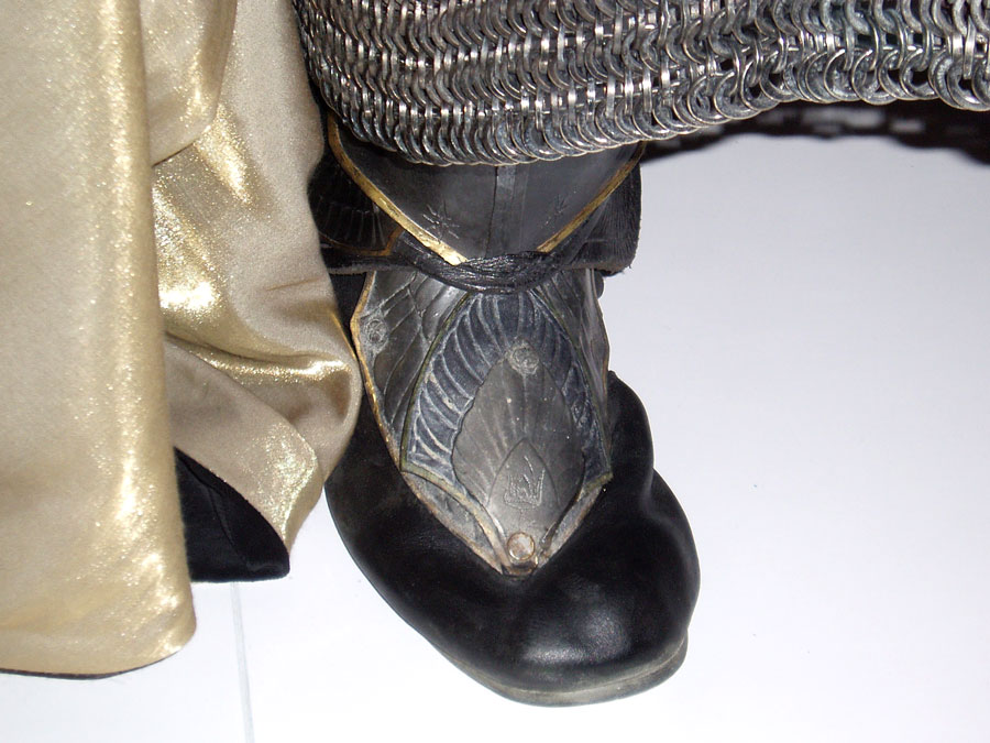 Aragorn's Royal Boots and GreavesThese are the same both for the Black Gate armor and the Coronation armor. The BootsThe boots are sturdy, well worn black, round toe, mid-calf high boots... ie, the same boots that most of the men of Gondor wear. Standard riding boots with just a little heel. These are cover by heavy decorated Greaves . The Greaves:2 layers of black leather