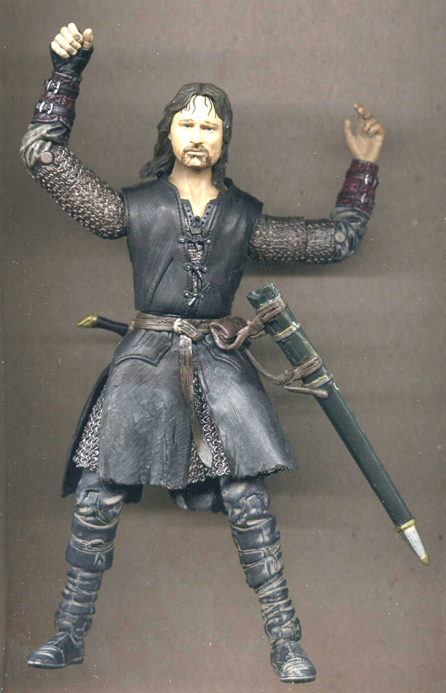 For the Helms Deep battle, Aragorn dons a mail shirt. He wears his