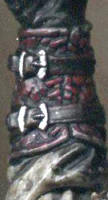 | Jerkin detail, note the patched pieces of leather.