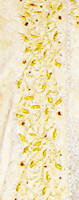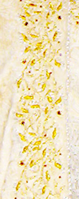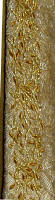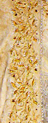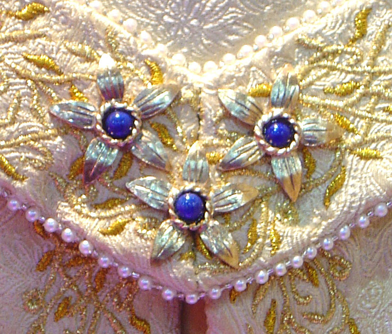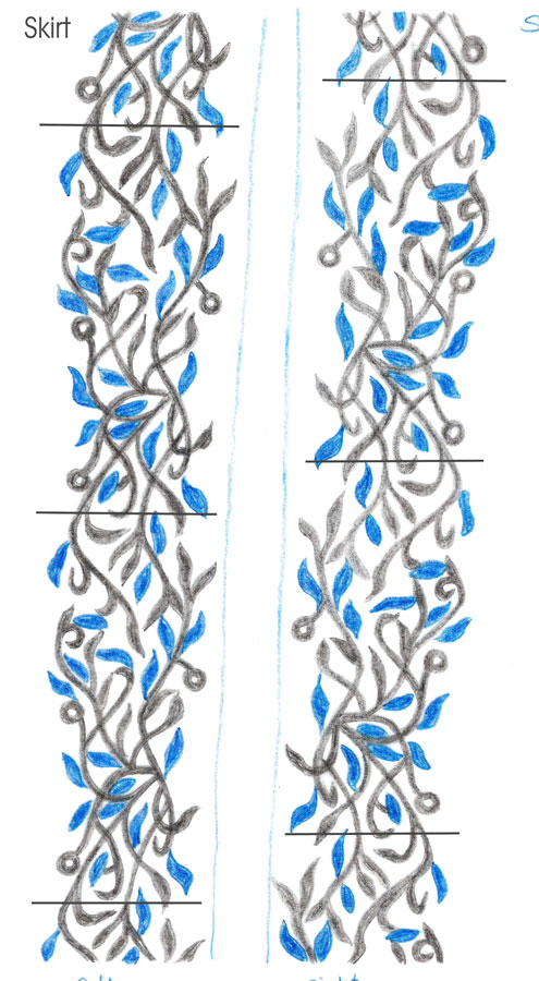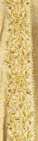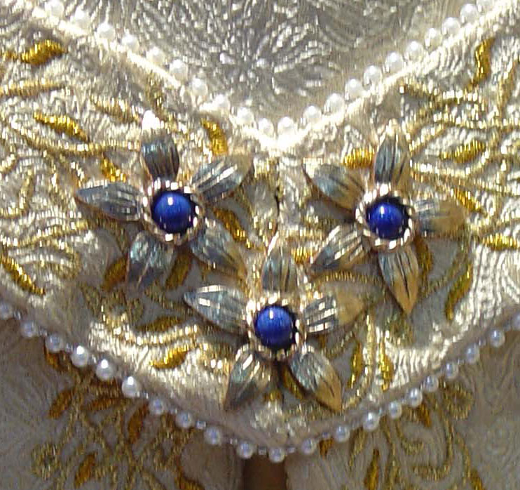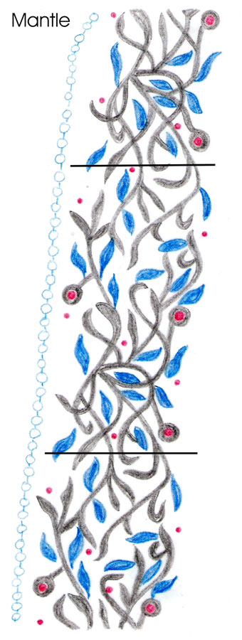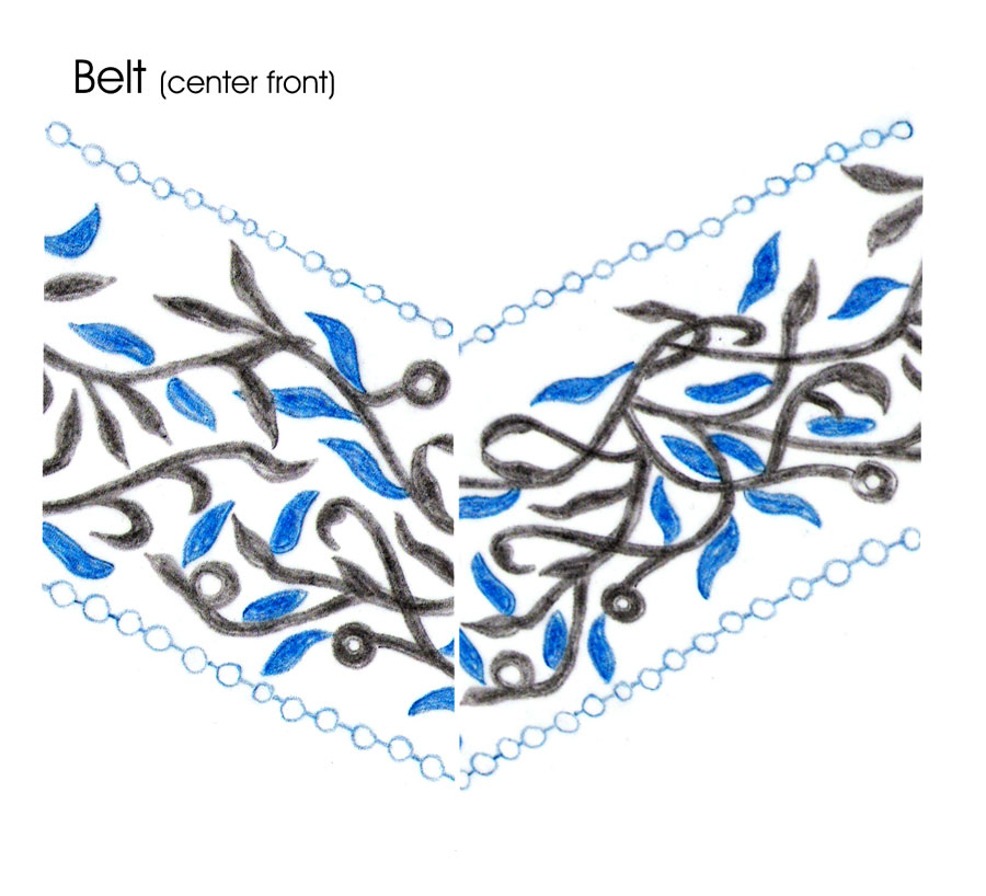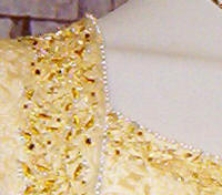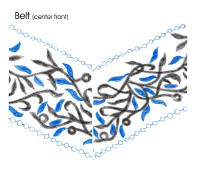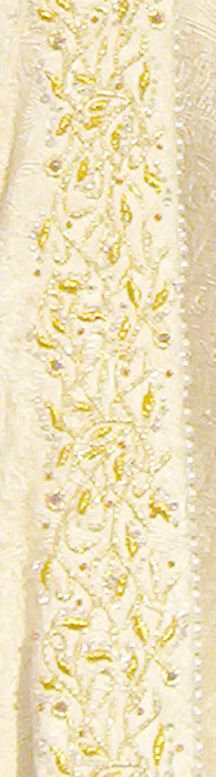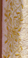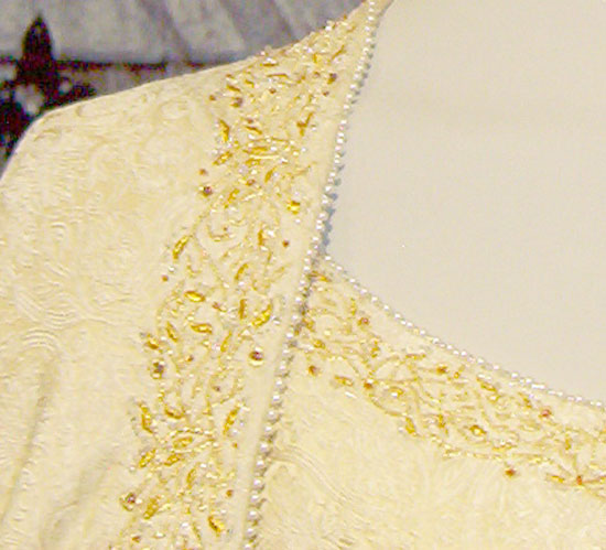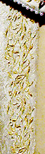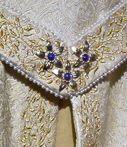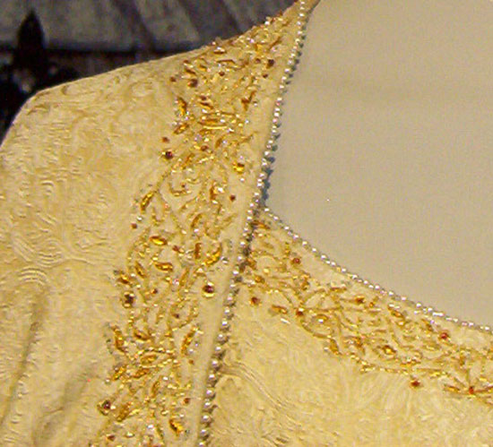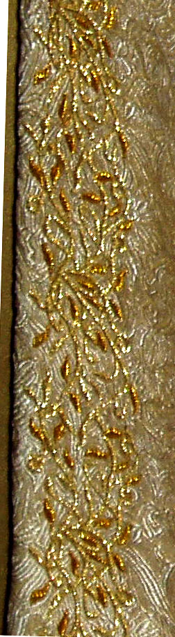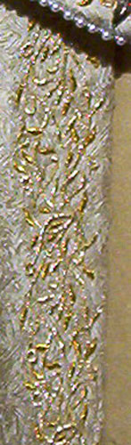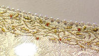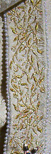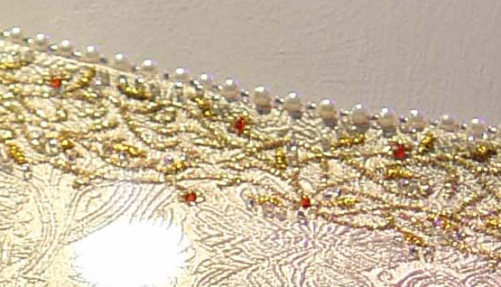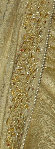 The trim is more complex than it looks. It starts with a machine embroidery of tiny leaves in two shades of gold. At first it look like it might be a variegated gold, but close study shows that some of the leaves are a darker gold, and the pattern repeats (See our diagrams below for the actual pattern.) There are 3 variations, not two of this design. The wider designs is on the mantle edge and the belt. The narrower version is on the front opening of the skirt. The neckline is a separate pattern about as wide as the skirt. There is a wonderful piping inserted in the seams that show the most. This consists of a mini pearl alternated with a shinny mirror-silver cut bead (smaller than a standard seed bead). This piping is used on both edges of the belt, as well as the edge of the mantle and neckline. It is not used to edge the skirt open. That is plain. There is also beading in some areas. The beads are a bit hard to define. The silver ones are seed beads, but the red have a translucence that looks like they possibly could be small garnet beads. There are two sizes: small seed bead and ultra small. Only the neckline and mantle edges are beaded. Only the mantle has the silver beads.