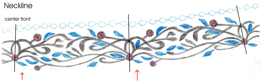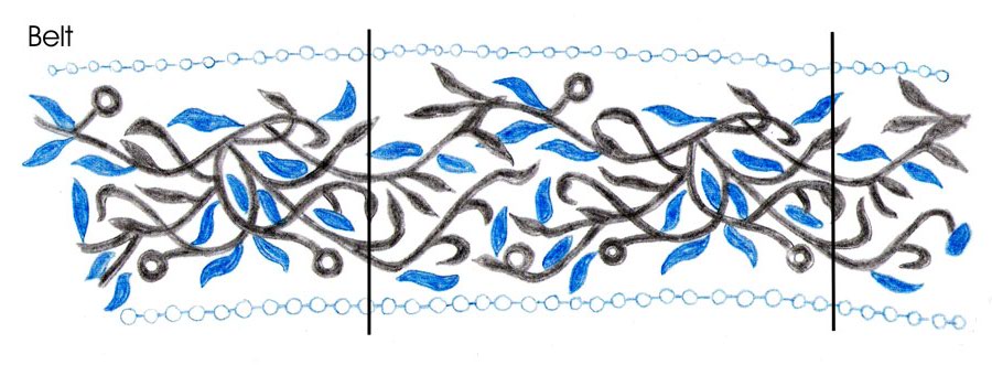 Pictures thanks to Secret Elf, Silvara and Kelldar Eowyn's Coronation Embroidery PatternLight gold thread= dark grey, dark gold thread = blue, bed beads noted in red. However, not all the red beads are placed in the identical place, the patterns are slightly variable. If for any reason, you need the trim at a higher resolution, please contact us. Thanks to Katrine for all the cross-eyed work of figuring out the patterns.