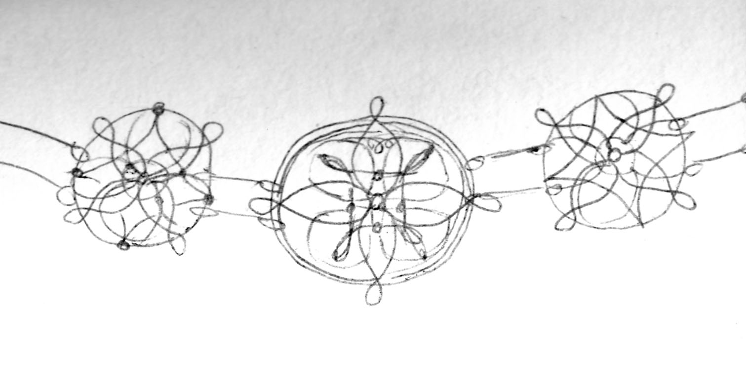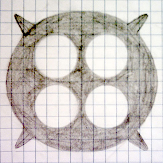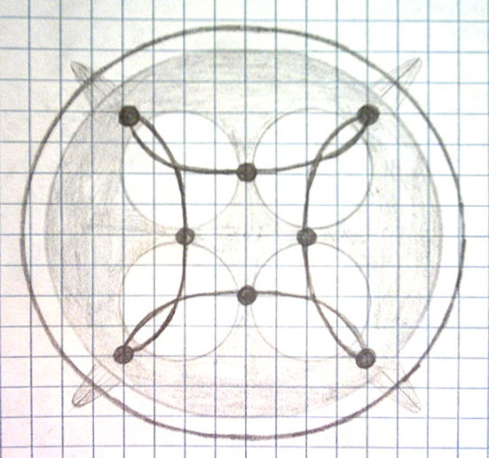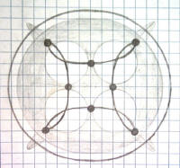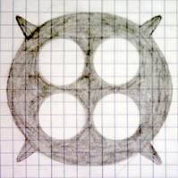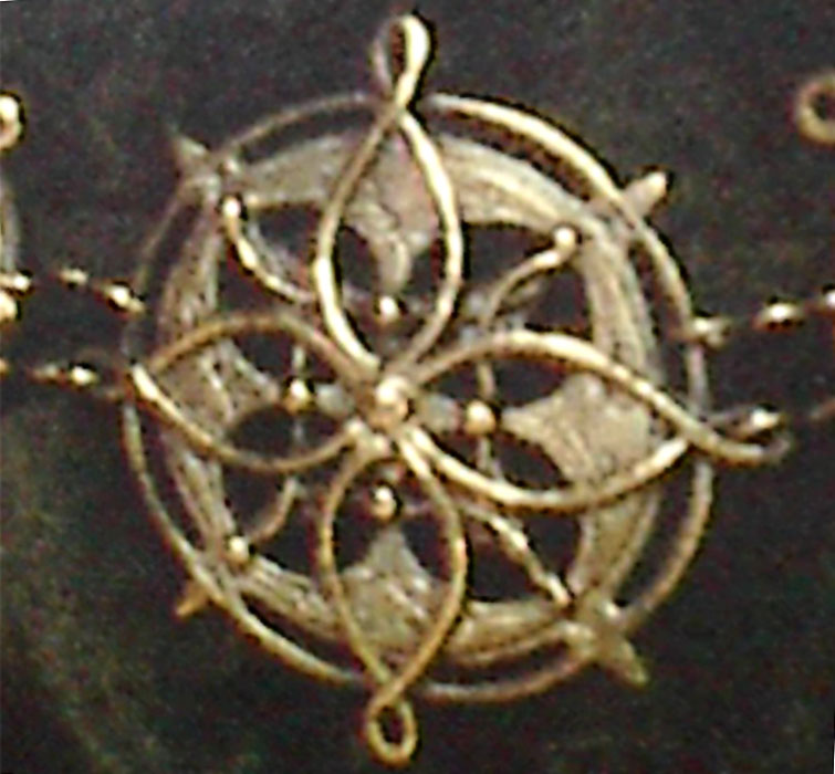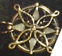 The Belt PatternVersion 2.0, as of July 2004 The center medallion looks to be about 3" and the side ones 2 1/2". Both styles are make from 3 layers. It starts on a flat base and then there are metal wire loops and balls that layer upward for a 3-D effect. Note: the patterns are not to scale. They are large to show the design. Reduce them using photo editing software or a copier. Thank you to Mirjana for Version 2 of the belt medallions. Her scrapbook entry <here> Making the beltThe belt can be make out of a number of products. On the low end, the backs can be made from plastic or fun form. Beyond that they can be cut from tin or even cast. The top layers could also be made of the foam, but would look better made of wire. To get the twists, it would be better to have a jewlry jig (one of those peg boards for twisting wire). If you don't have a jig, hammer nails in wood . Check out the Human Scrapbook to read up on how others have made the belt.