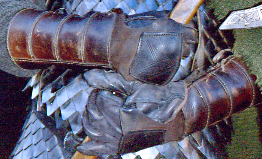 Note the stylized vambrace/gauntlet loops over the thumb and