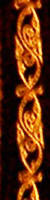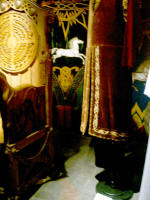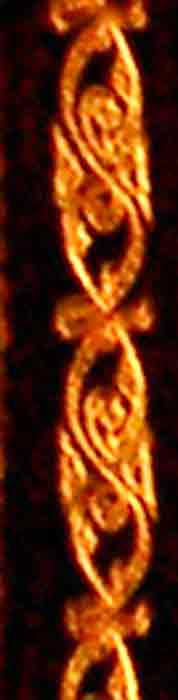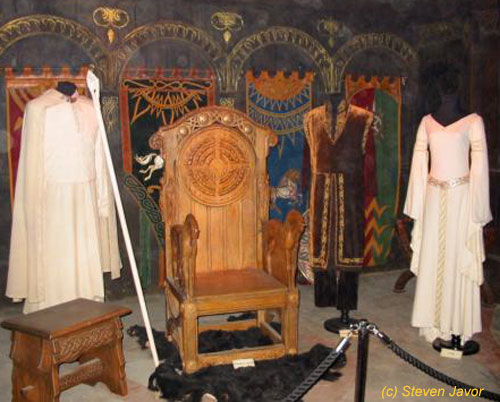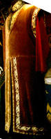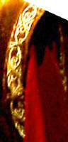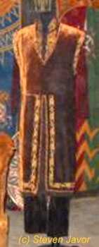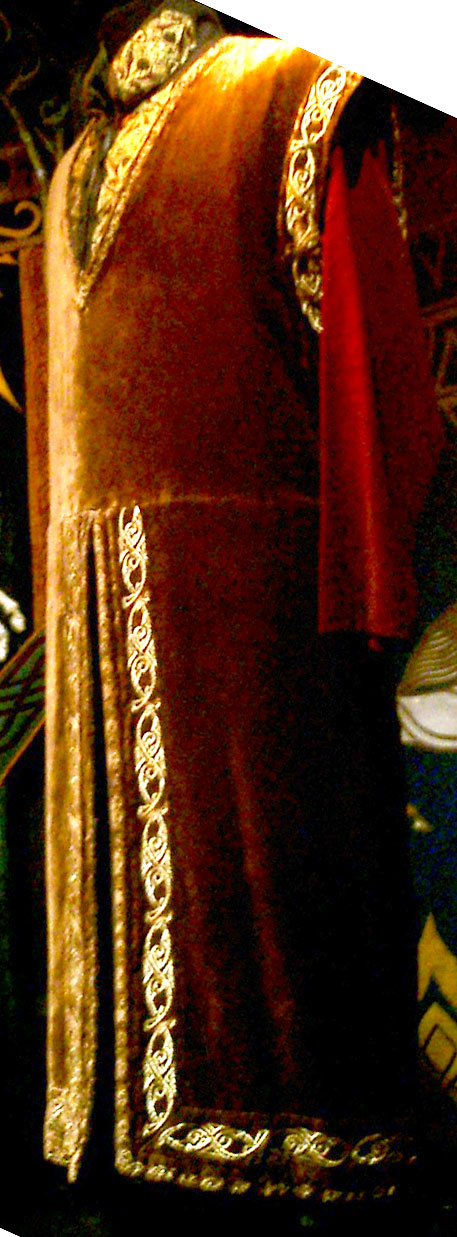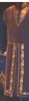 Basic descriptionThere appear to be four pieces to the visible part of Theoden's "Royal" outfit: ShirtThe deep burgundy/wine undershirt, long-sleeved. Possibly silk blend but looks very rich. Could also be wool. The large Celtic gold-work near the collar looks to be on this undershirt, but on a broad, lace-up (bi-directional lacing) black leather placket. Very high Mandarin collar. Embroidery is gold, black and green covering the leather placket. Under tunicAre there two tunics??? Green sleeveless tunic very widely cut under the arms. Low neckline and wide button down front placket. First layer, black wool tunic. Red velvet sleeves. It is about 3 inches longer than the outer tunic. Split front back and sides, per toy. It zips up the back. TrouserSlim black trousers. Tucked into his boots Over-tunicBrown cotton(?) velvet or possibly a nappy suede. There is a seam that runs across at the waist. It is split front and back. There is a seam at waist-level where the bottom part of the tunic meets the upper. The back of the tunic is also seamed... per the toy. There are slightly extended sleeve caps. The sleeve caps are heavily covered in gold, black and green Celtic embroidery. The bottom slits and hem line are trimmed in inch wide by 3" long embodied motifs similar to the sleeve caps. These are built onto a strip of the same fabric as the tunic. The wide V neck line and and the slit are edged in a thinner gold trim. (Note: most of the neck area embroidery belongs to the undertunic/shirt. GauntletsBlack leather. Tooled with gold and burgundy etch-work. The design on the cuff is two stylized horses in gold, with burgundy heads and haunches, surrounding an eight-point star with a circle in its middle. Gold scrollwork round the edges. These gauntlets lace CloakNut much to see as most of it's behind him. Looks to be a fine knit (maybe even a matte satin) with green on the outer and a burgundy lining. There is gold cord edging visible on the hood and cloak. Held together with a large, round clasp of gold, again with an eight-pointed star. There is a small triangle piece off the back of the cloak. It is edged in the same gold. It is reminiscent of a hood, but is just decorative because it is far to narrow. (Thanks to Megan for the original summary description.)