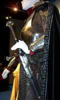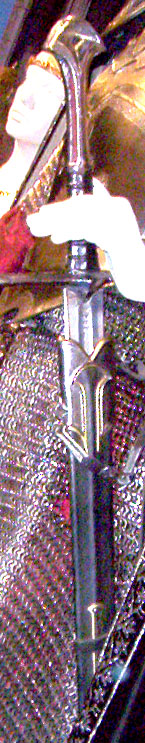 Detail"Andúril/Narsil has a classic tapered blade, with the hilt having some interesting design features. The ends of the cross and pommel have a triangular cut-out, lined with bronze, and both have a subtle three-dimensional form." Peter Lyon, from an interview. Inscription on Andúril: "Anar Nanye Anduril i ne Narsil i macil Elendilo. Lercuvanten i moli Mordoreo. Isil" which means "Sun I am Anduril who was Narsil the sword of Elendil. Let the thralls of Mordor flee me. Moon". This same inscription appears on it's belt and on a steel & brass plate on the back of the scabbard. Who has carried it it (OK, main folks who have)Authorized RetailerThe Movie Artisan