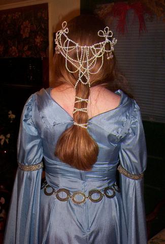 The headdress was formed by twisting pearl strands with beading wire to get the right shape and then playing with the loops. The flower bits and ends of the loops were glued to clear hair combs.