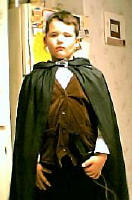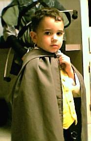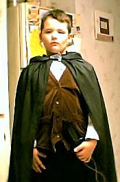 My youngest nephew went as Merry last Halloween. The vest was modified from an old boys vest pattern and randomly quilted. The shrit was bought and the cape my own pattern, just a rectangle with a hood really.