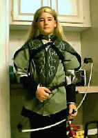 Last Halloween my oldest nephew went as Legolas. The jerkin was of material I had at home, and mostly of my own design, with help from Alley Cat Scratch, of course. The under shirt is silver silk dupioni scraps sewn onto a t-shirt where it would be visible. The quiver and straps, that you can't see, are made from felt, with arrows of dowel rods. The cloak is hoodless and simply two wedges sewn together to get the most out of the fabric. This was a quick throw together costume, and so isn't as accurate as we all would like!