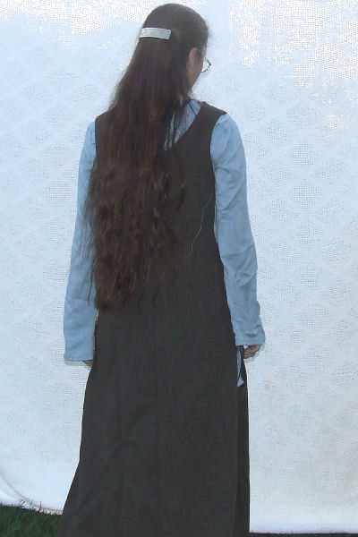 GOWN: I made this dress mostly from a simplicity jumper pattern—I don't know what the number is, but I've used it for everything from Padmé's peasant vest to a bodice for my mother. I had to alter it somewhat so it was a little more tapered. To make the indents in the side, I traced an oval and chalked it on the fabric, then cut along the chalk-line. The fabric is a heavy-weight cotton in a warm brown (warmer than it looks in the pictures). I self-lined it, and the thing is so heavy, you wouldn't believe. After I sewed the pieces together, I hammered the grommets (bronzed medium from Wal-Mart), bought my cord (1/4 gold), and put a "fancy" stitch around the neckline in a slightly lighter brown than the dress. It's the only ornamentation I put on it. TUNIC: I found the ideal fabric at Beverly's… part of their "sheers", it's blue with a line running through it. It was pretty stiff when I bought it, but when I washed it, it loosened up and shrunk a little bit, so it got a sort of texture to it. I think it looks almost exact. I traced the same jumper pattern, drafted my sleeves, and sewed it together. There wasn't enough for a whole dress, or I would have made the real thing with the split skirt; instead it ends at about mid-calf, which is why you don't see the hem in the pictures. This was my 8th sewing project… the whole thing took me two weeks.
