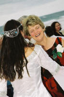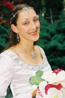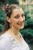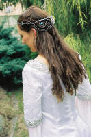 The beading was hand-sewn bead-by-bead onto a metallic ribbon base, and I used a silver braid for the border. The dress is Winston Satin, and the sleeves from a light-weight rayon/lycra type fabric which was hideously expensive!