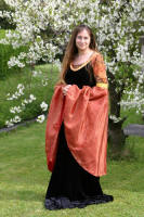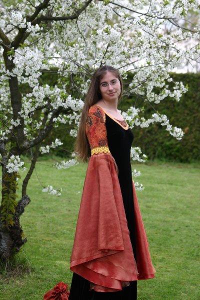 The overdress is made of stretch black velvet. I added a triangle of black velvet to both sides, going from the waist to the floor to get the necessary wide at the hem. After looking at the result it seems that it would have been better to add a godet in the back instead, however I didn’t change it. It has no zippers as the neckline is wide enough for me and the fabric is elastic. I needed to modify the necklines of the two dresses to fit together. I did it with the help of a friend. First we made a special pattern for the band at the neckline of the overdress. I sewed the band of a shimmering yellow fabric. It fits very well. Next step we also made a pattern for the neckline of the underdress. I didn’t add a band at the neckline of the underdress. I know that isn’t authentic but I like the fabric of the underdress so much that I thought it would be nice so see it at the neckline too. I just trimmed and hemmed it. The band of the overdress sometimes was moving from the underdress so my skin was visible. First I thought of attaching a little snap to keep it in place. However, that would have pulled too much. So I sewed the two dresses at the shoulder seam together. Now it’s a bit difficult to get in because the overdress hasn’t got a zipper and I need someone to close the zipper of the underdress. It would have been much easier of the overdress also had a zipper. If you intend sewing a dress like mine I recommend to add an invisible zipper in the overdress as well. You might not need to sew the two dresses together but in this case, it make things much easier.