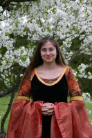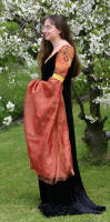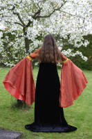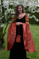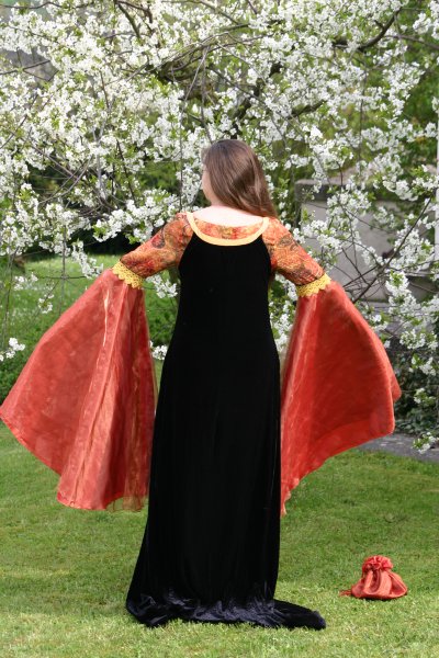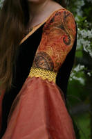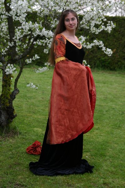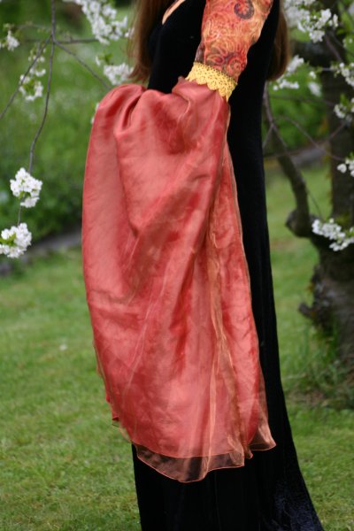 I based the upper half of the sleeves on the pattern for the underdress. The lower sleeves are elliptical half circles. They are two layers of fabric, the lower is a rust red shimmering polyester (it was a curtain) and the upper a golden semitransparent fabric (polyester). Both layers have rolled hems. The band between the upper and the lower sleeve is made of two layers. Over a black velvet band I sewed a strip of yellow crochet trim.