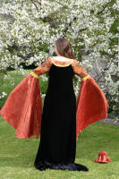 I used Burda patterns for both the over and underdress. The overdress is Burda No. 7/99 model 105 and the underdress is Burda No. 7/03 model 107. The underdress has an invisible zipper. I did not have a lot of the orange fabric so I used it only for the visible parts of the under dress and added black lining for the rest.
