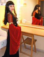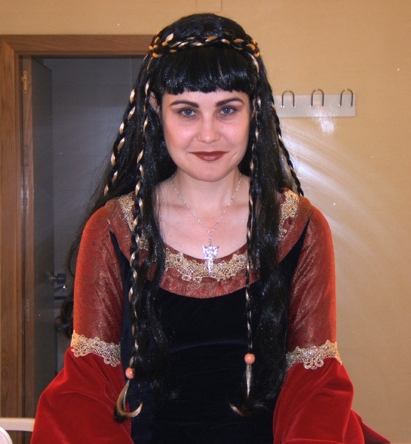 I wore this gown at the Carnival of Almeria (Spain). In order to make the dress, I studied the numerous photographs and examples that there are in your web. The pattern I made from by hand drafting it. The under dress fabrics are a combination of midnight blue polyester, red brocade and blood red polyester velvet. The over dress neck band is made of the same brocade as the upper sleeves of the under gown. For the rest I used midnight blue polyester velvet. I bought the thick gold trim from a local merchant. I completed my disguise with a medieval wig and the evenstar necklace. In addition I added elf ears.
