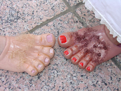 Both hobbits' feet were "Monster Feet" which were trimmed down to fit each hobbit, and completely repainted to match their skin tones. (Also painted on wrinkles on the toes, and nailpolish for Tootsie - she insisted!). The top was coated on clear elmer's glue, with doll's hair added on top (brown for Toosie, strawberry blond for Frogo).