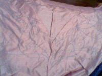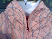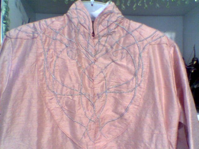 I started researching this costume in August 2004, and if it weren’t for everyone's help at the message board I'd still be ogling at this costume and not wearing it. I found as many pictures as I could and started looking for a pattern for the tunic, I found simplicity 5589 ( I didn't really want darts and I didn't really know how to draft so I put it in a pile for a rainy day, and I found simplicity 0507. I did a few mock ups of this and of course it was baggy, nothing a secession with pins and scissors wouldn't help, (and that was my first lesson in drafting, I don't recommend doing it that way but hey it worked for me! ) so I cut it down to size, then I started on the yolk and the collar, I measured where I wanted the yolk to start and end and compared how it looked in the pics, and drew out a pattern on paper. Easy enough. Then I cut the muslin and pined it on, horror of horrors! I didn't think about how it would fit over my bust, so, the yolk was pinned cut repined and re-cut till it worked and looked nice. I used the pattern for the mandarin collar from the package and it was not too large, so that got cut down to size, now all I had to do was the sleeves, I used the sleeve caps from the pattern I based the tunic on, (those too were now too large but I liked the way the sleeves looked, with a bit folded under so I left it and belled them out toward the end. voila! I had a full muslin that looked nice! (w/o the emb I didn't think to do a mock up of that yet but I had an idea)