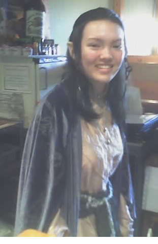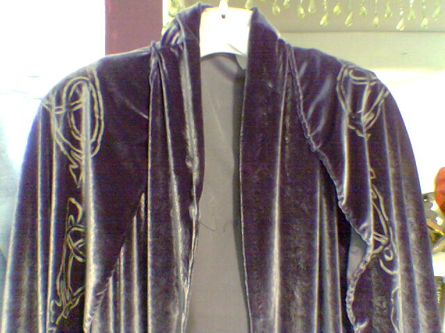 So after I did that I sewed it all together and rolled the hem and scalloped the capelets, (I was too lazy to line anything so this is all not lined) so I made the stencils myself for the "etching" (b/c this is stretch velvet I can't etch so I used fabric paint) I don't have a good pic of the patter/stencil so you're just going to have to look at the capelet pics. so then I could label the drape as finished! So I went to the embroidering. Big pain. I used silver thread and I used over 500 yrds of it! and I got from my 1" per hr to 5-7" per hour! The tunic was done! Now all I had to do was the sash and belt. The sash was easy so all I did was find the fabric on ebay a seller called Oregonsilver and got the dark silver color, whacked it to be about 4 yrds long and 6" wide and then it was done! (yes I'm lazy and now I had to get this done in two days! I didn't hem it yet). I figured out how to tie it and then that was as I said , done. moving on to the belt, I cut the fabric to be 3" wide and 4-5" shorter then my waist measurement, sewed it together with some heavy stiff fabric in-between and sewed some silver rick rack to it to be the ties and trim. Then braided about 3" down and all the rest is loose, there are three ties on each side all varying lengths at the end but they hang down about 4" shorter then the sash.