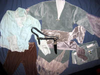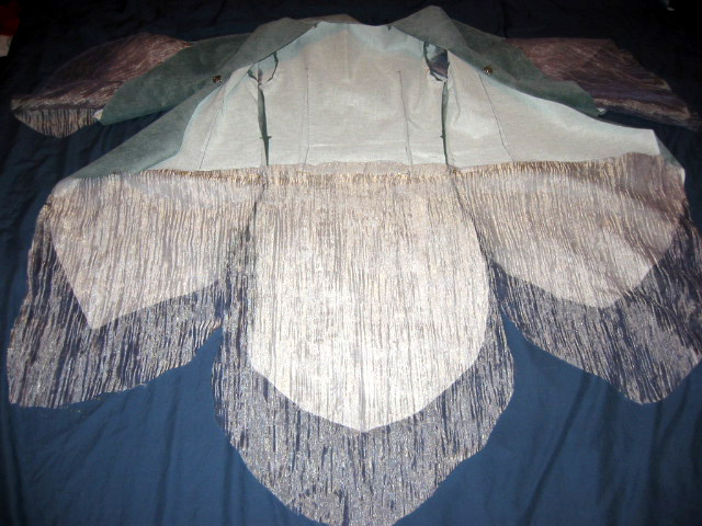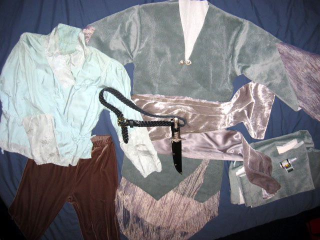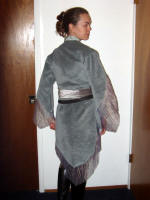 I used upholstery fabric that is somewhat like suede or velveteen, and goassamer crinkle fabric that is typically used for curtains. Both were in the bargain bin at the fabric store! Also, neither fabric ravels, which saves hemming time. The pattern was based on Folkwear's "Turkish Dancer" Entari tunic. (http://www.folkwear.com/caravan.html)