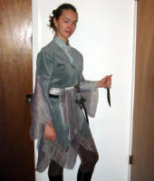 the waistline The underblouse could be constructed from Folkwear's "Nepali Blouse" (http://www.folkwear.com/asian.html), but I had a very similar shirt already. For the gossamer lining, I simply safety pined it into the sleeves and along the hemline, then cut the bottom edges into the shape I wanted. It was important to roll the fabric before inserting it in the sleeves, ensuring there was enough overlap for the desired layering effect.
