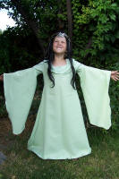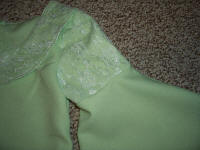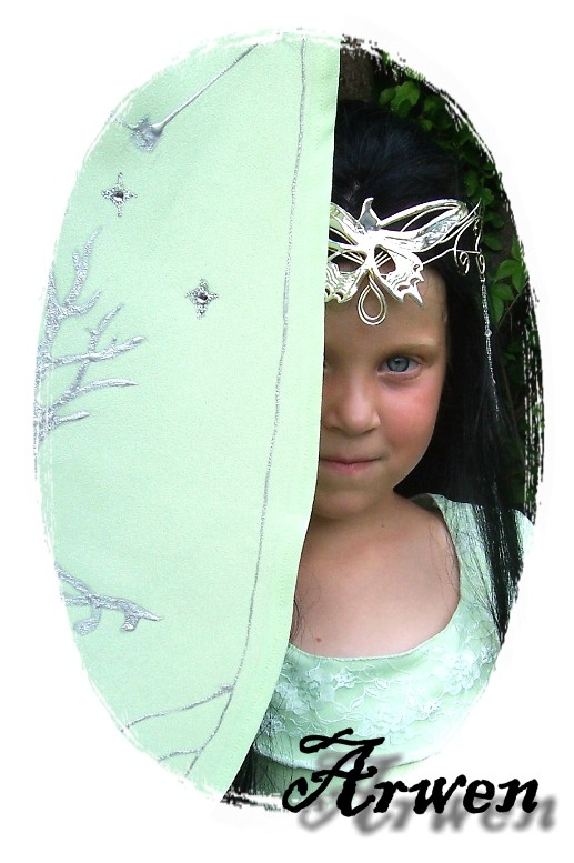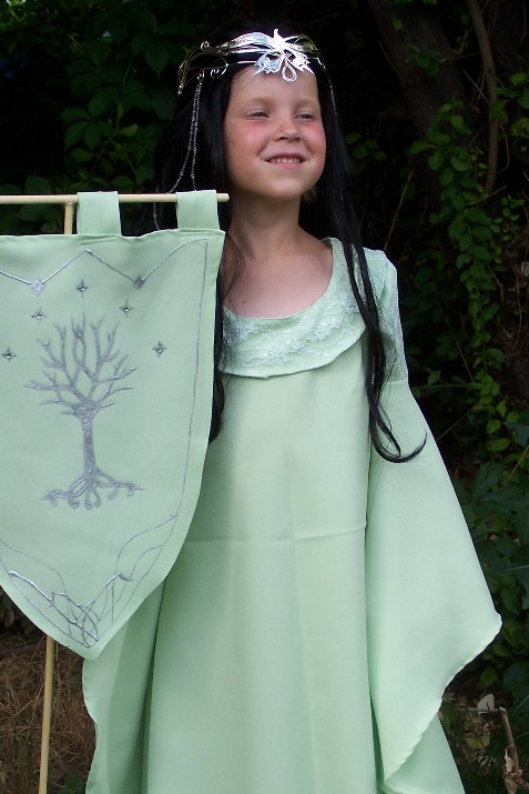 I was going to do the gown in lime green panne velvet but at the last minute I found this mint poly crepe at WalMart for $2.00 a yard and the color was much more appealing to me than the lime so I bought 3 yards. I also purchased a yard of white lace material for $3 which I used for the detail on the upper sleeves and collar. I dyed the lace a light green to better match the crepe. Total this costume cost me around $12.00! Beat that Rubies! I used the remaining fabric to make a matching Trick or Treat bag and a miniature version of the Coronation banner that Arwen carries in that scene. I found a picture of the banner on an eBay auction and just traced as much of the design as possible onto my tiny little banner with pencil and then filled in with silver puff paints and rhinestones for stars. It isn't anywhere near true to the original and even further from perfection but my daughter didn't care and its all for fun! Two 50-cent dowels glued into a T shape hold the banner and she was ready for the Coronation!