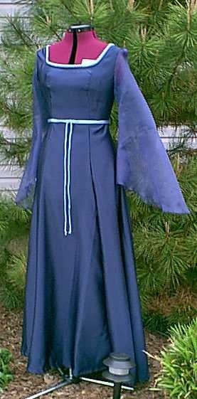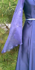 The fabric is Navy Blue Bridal Satin which I purchased for 1.99 per yard. and the sleeves are Navy Blue sparkle organza also purchased for 1.99 per yard. The cording belt and piping at the neckline came in a scrap bag of trims I purchased from Hobby Lobby for 1.50. The simplicity pattern was on sale for 1.99 and the McCall's pattern was already in my pattern stash. Total Cost of the dress: $19.49 Not to shabby! I like to make up new dresses as inexpensively as possible while I work out the kinks!! LOL! -- Jennifer