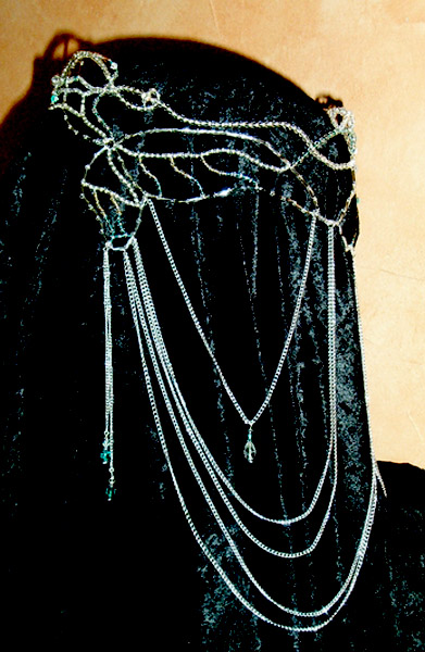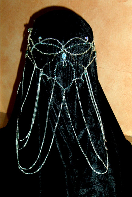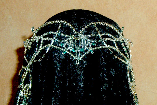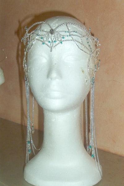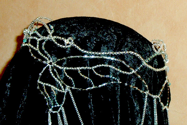 Arwen's Butterfly Crown in wire & beadsBased on your pattern, I have worked out a way to make a Butterfly Crown of glass beads. I thought it would be more simple to do it that way -and it was- but it took almost as much time as the sheet metal crown. However, you do not need as many supplies. I think this is quite easy to make, even for somebody with only few skills. I started with the side pieces using the measurement of your crown pattern, then made the front piece and fixed it between both side pieces. Last I created a butterfly between the ends of the sides because this is the best way to get the size right. I tried to use your pattern for the back as well but it did not work for this method. Instead of beading lines I used real metal chains.