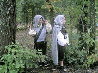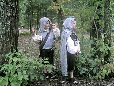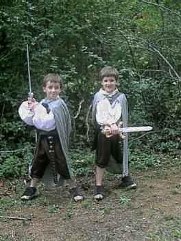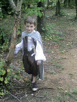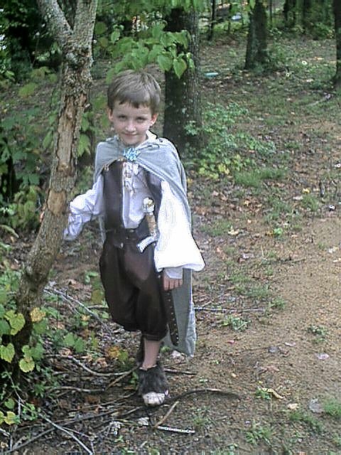 I have made two hobbit costumes for my children. Both are 18th century workshirts (made from antique colored muslin and white cotton, $1.00 a yard at Joann's) and drawstring knee pants (brown cotton, $1.00 a yard) were made from a pattern on Dawn's costume page. I believe you have a link on your site. I altered the shirt to leather lacing at the neck and cuffs instead of buttons and changed the collar on Sam's antique yellowed shirt to include a V shaped pattern of cloth sewed to the neck opening on each shoulder seam to allow for more head room through the neck and a larger collar. I made the cloaks w/ hoods from scratch (a very loose weave cotton in gray/light green found at wal-mart for 1.97 a yard). I used a small wooden maple leaf from AC Moore art supply store and hot glued the pin on the back. I painted each with metallic puff pants, Forest green and pearl. The Vests are my own pattern. Frodo's costume has a faux leather vest, Sam's is blue cotton blend in a coarse weave. The swords and belts are store bought but the scabbards and Sam's pack were made from faux leather and metal studs decorating the scabbard are from a Bedazzler kit. The Hobbit feet are just a pair of old sneakers with a nude colored nylon "footy" wrapped around them.. See the instructions with more pics over in our makeup section for Hobbit Feet. For safety I placed a zig zag pattern of clear silicone caulking on the bottoms of each shoe to prevent slipping on wood floors. Total cost was around $25.00 for both costumes together. Sorry no pointed ears due to the fact that my 5 and 7 year olds would have them pulled off very quickly.