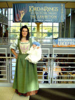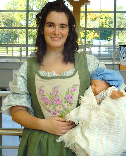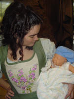 The baby will also have a wig and a better-fitting hat. The baby is a La Baby doll which I've had since I was 10. She has been retro-fitted with a rice-filled body to give her good weight (she weighs about 5-7 pounds, and it's impossible to hold her without rocking, bouncing, or patting, even my non-maternal friend had to rock her when she held her) Her costume consists just of clothes that I bought in thrift shops, which was cool 'cause she has little pockets in her "jumper," which allowed me to carry my museum membership card and some cash (though I made my friends carry my camera and wallet).