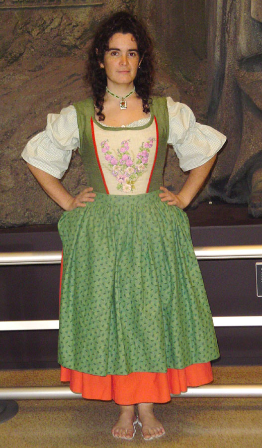 The skirt is made of a multicolored silk and is cartridge pleated. This makes it fuller than most hobbit skirts, but I really like the lines of it. It and the apron were made with no pattern, just big rectangles. Underneath is a very simple rectangular white cotton petticoat.