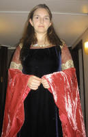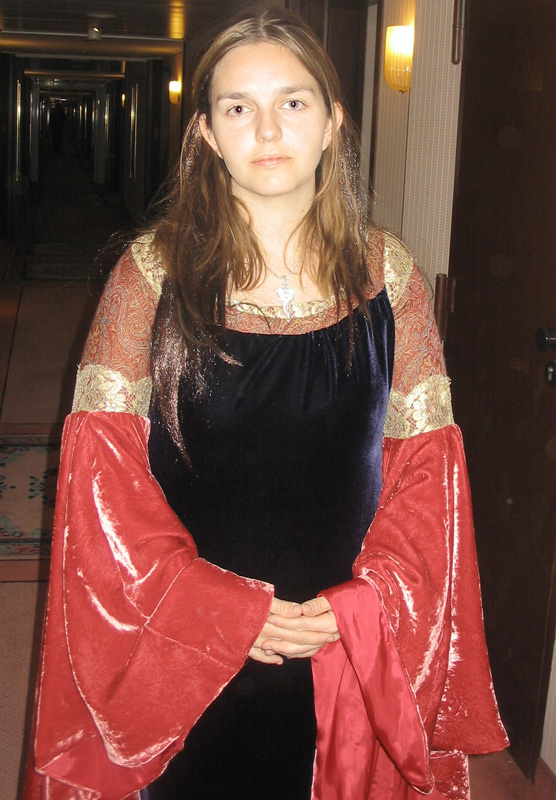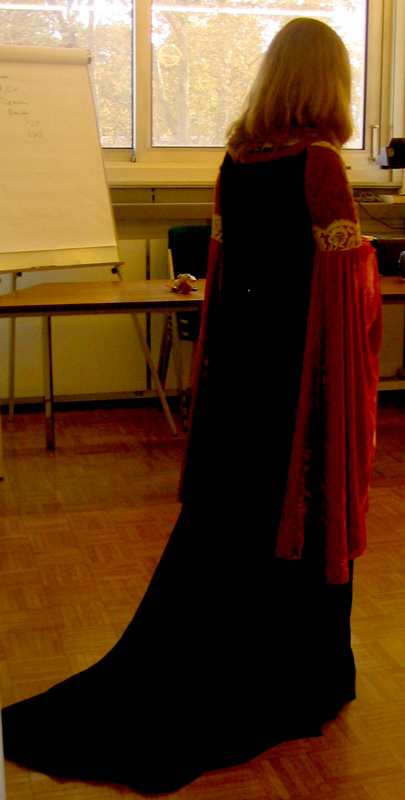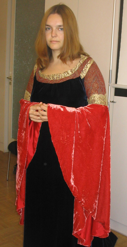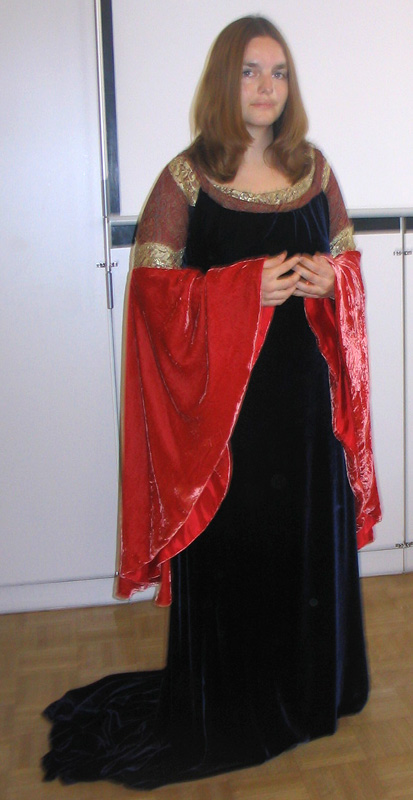 General description:This dress was also made for “promenading” at the RingCon, because we found a midnight blue silk velvet that looked so beautiful! The underdress has a small train and a wide lace trim at the neckline. The upper sleeves are also trimmed with the lace and the lace trims are embroidered golden. The lower sleeves are typical Arwen style wide sleeves and the jumper is hold by a narrow band. The dress has a very long train and the hem of the jumper is a rolled one. Accessories: