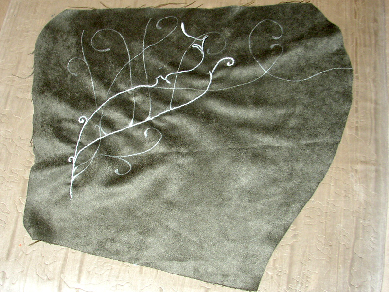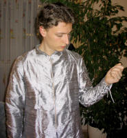 General Description:I made this costume about one year ago for the premiere of the last Lord of the Rings movie. The shirt has high collar and the sleeves can be corded with silver cords. On the sleeve it has silver embroidery. The Jerkin is also embroidered with silver yarn and can be corded on the sides and the center back with leather cords. Over the Fellowship outfit a wide cloak is worn which has a stand up collar. The stand up collar drapes because of the silk velvet very soft around the neck. It is closed by a hook and an eye. Accessories: