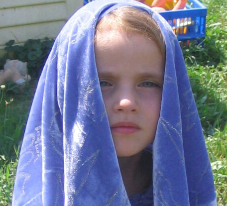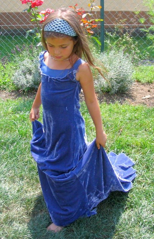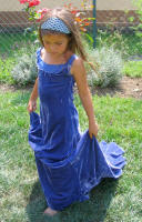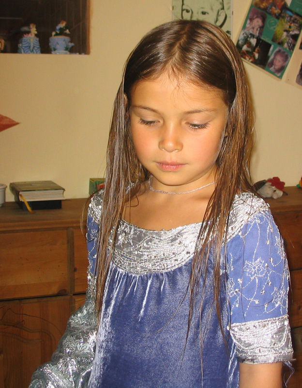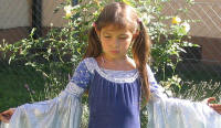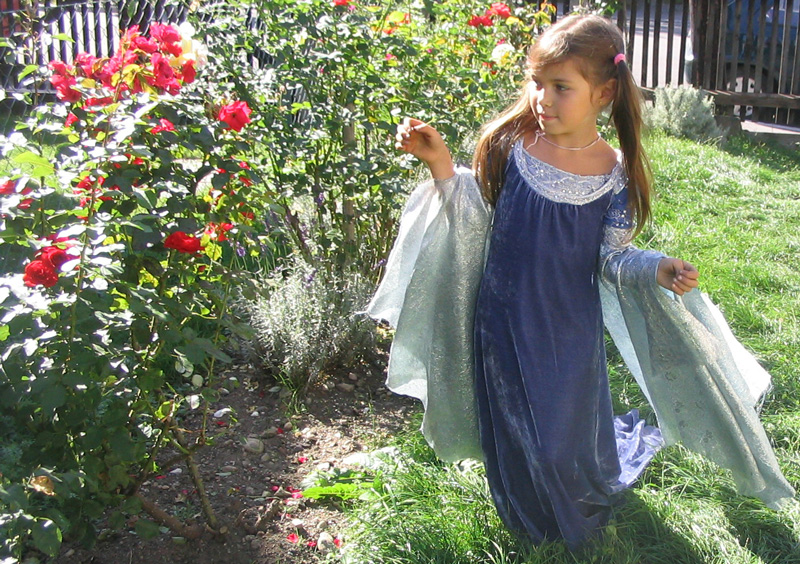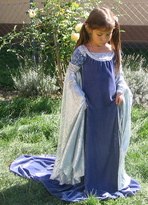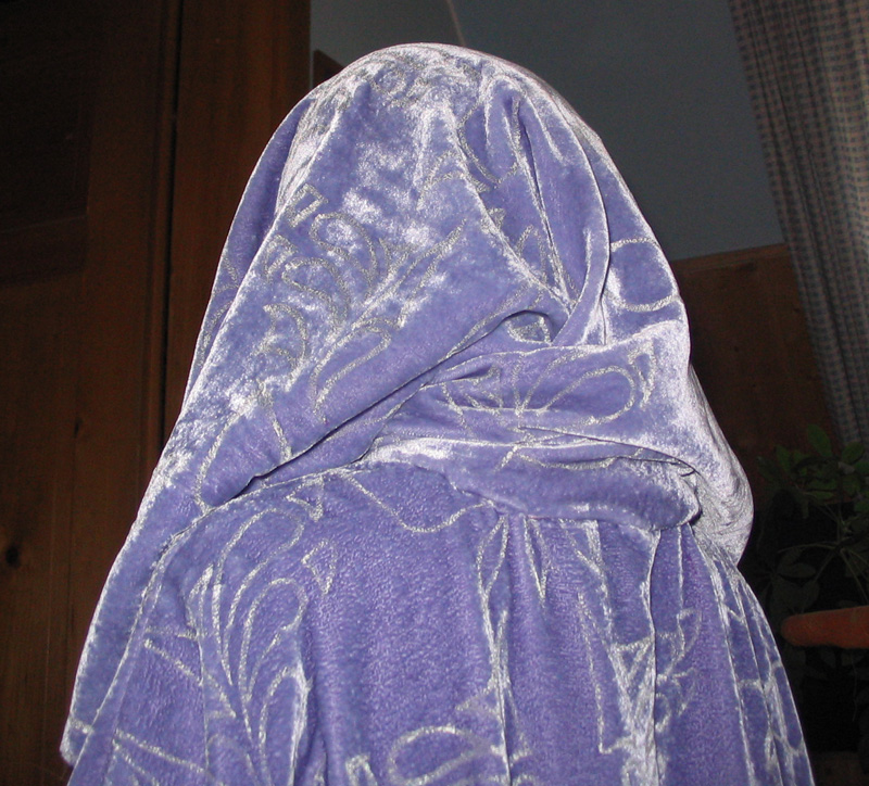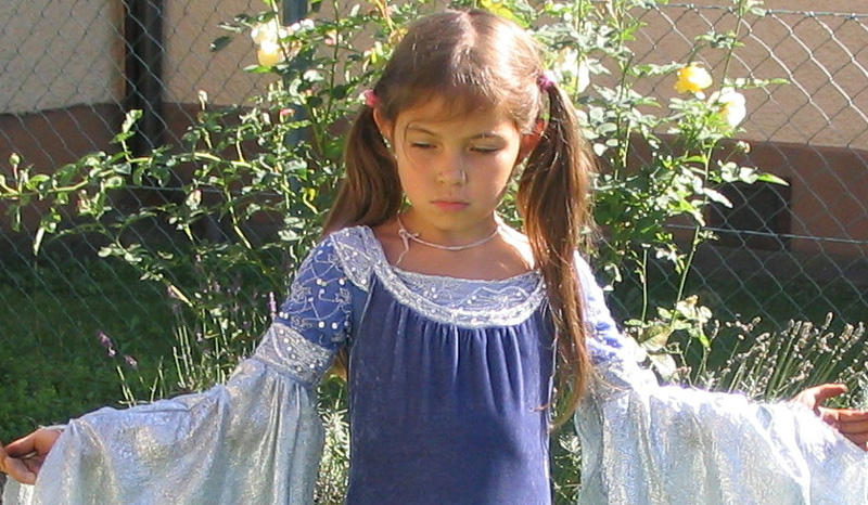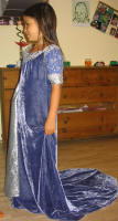General description:This is the first of three costumes for our children. They were actually made for the costume contest but unfortunately only children over 12 could take part. The underdress has a small train and a wide round neckline. The upper sleeves are embroidered with the floral pattern of the original dress (thank you for that!) and there are wide trims at the neckline and sleeves. The trims are also embroidered and beaded with bugle beads and rhinestones. The lower sleeves are very wide and hemmed with a rolled hem. The jumper is held by a narrow band in silver which is embroidered and beaded. The silk velvet jumper has a long train and is also hemmed with a rolled hem. The cloak is cut as a circle and the silk velvet is painted with silver colour. The hood is very big and turned around in the back. The cloak has also a train. This was really our most glittering dress. Accessories: