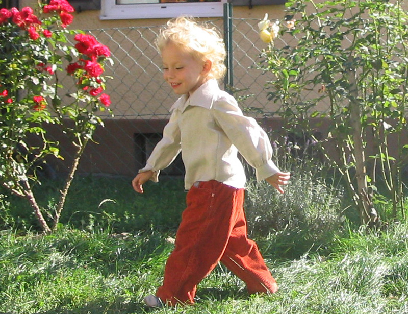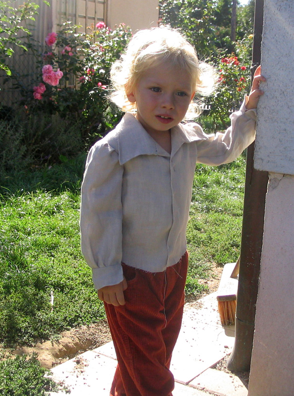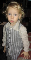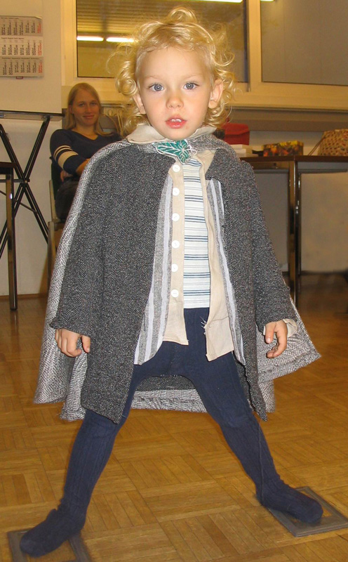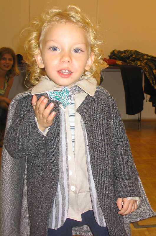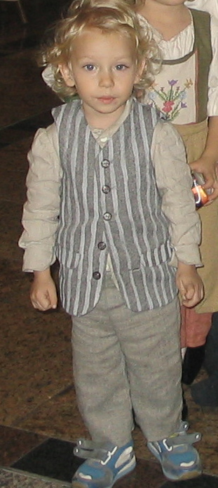 General Description:My little nephew wore this to the ringcon2004 and it was quite difficult to sew it because he was really horrified of needles. So he just tried it on about 2 times and then very very fast. There is a shirt with slightly puffy sleeves and a turn down collar which is sewn through with a light yarn. In the back it is pleated and it closes with 8 buttons. The trouser reaches to his calf and is closed by a button in the back and held by suspenders. Over this there is a vest which is closed by silver black buttons and lined. The coat is longer than the vest and closed by dark buttons. Over that all the fellowship cloak is worn, but unfortunately I had not enough fabric for a hood. Accessories: