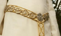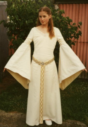 I used dun yellow and pale grey embroidery thread in stem stitches and French knots, and lined it with lots of interfacing to make it nice and stiff. The trimming around the neckline and armholes I braided myself because I couldn’t find anything suitable. One strand of brown and two strands of cream, a lot of patience, and I was away laughing. Now, the belt. This is the bit I am proudest of. It’s in two parts: the decorated girdle and the metal belt, which simply lays over the top. The girdle is made of two layers of old curtain fabric, with two layers of interfacing stuck in the middle for strength. For the decorations I just bought some gold coloured cord and sewed it on. It attaches at the back with hooks and eyes.