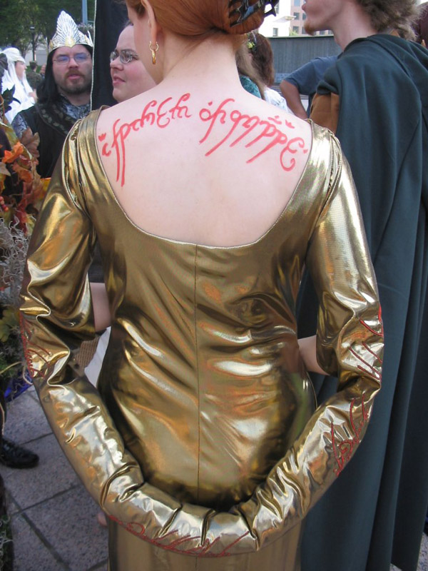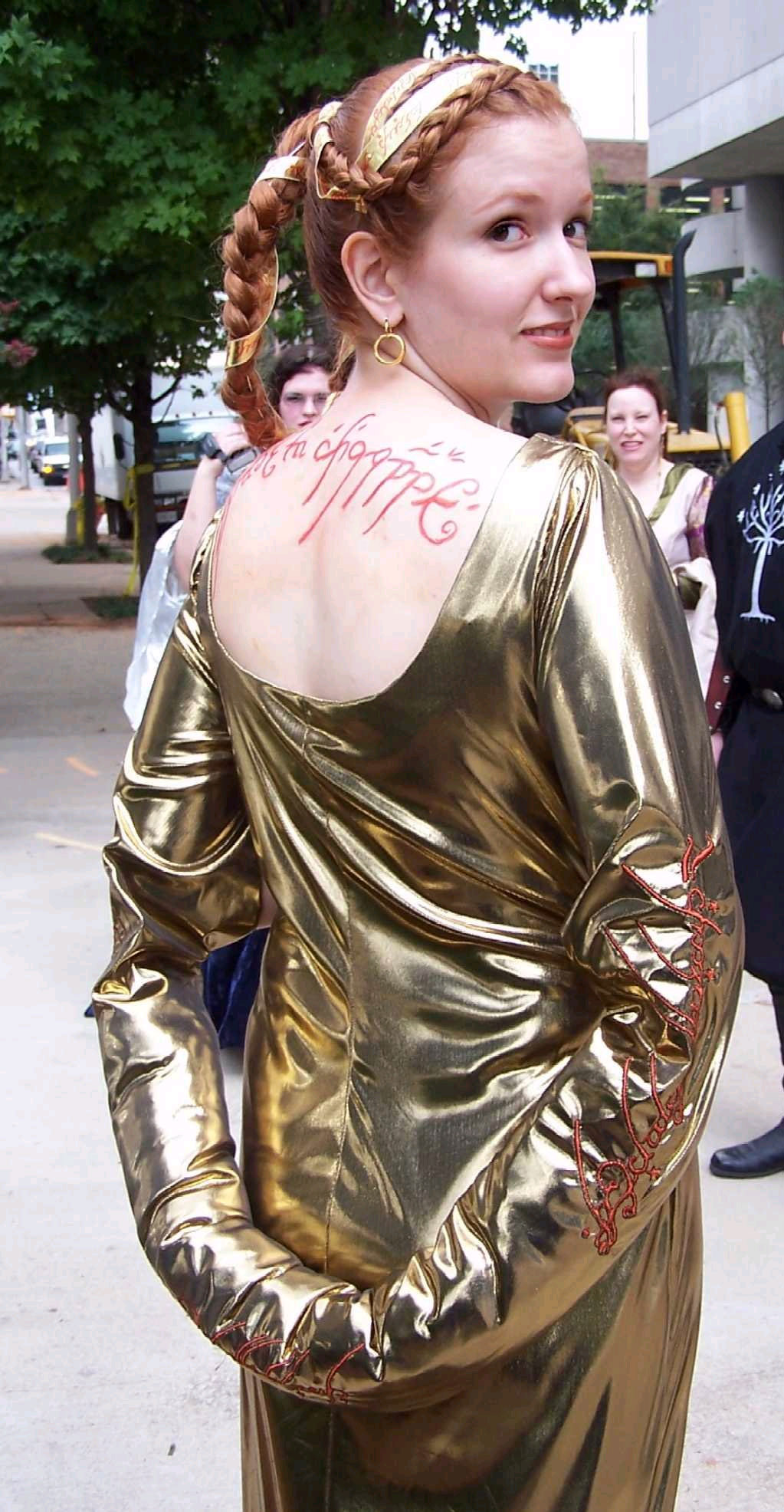 Christine made a matching One Ring bag (anyone who goes to cons knows that having a bag or pocket for your costumes is important) to match the gown. We originally planned for the script on my back to be composed of henna, but unfortunately the design just didn’t end up dark enough. So we used….a red sharpie J Sharpies actually work pretty well for body art! I purchased a pair of gold sandals from Newport News, and purchased some gold ribbon, which I decorated with the One Ring text using a sharpie. This ribbon was then wound into my hair by my talented hairdresser. She then braided my hair into a loop, and put a wire into the braid so that the hair would stay in a looped style, mimicking the Ring shape. The earrings were One Rings from 2 New Line bookmarks. I took the Rings off the bookmarks, and used a dry paintbrush to paint the lowered script design red, wiping off the excess. I then added the Rings to a pair of small gold hoop earrings I already owned. As a final touch, I took an extra voice box I had from a Build-a-Bear workshop, and recorded my voice whispering the One Ring text. We then put the voice box in the batting. So if you squeeze the Ring, you can hear it as well.