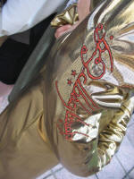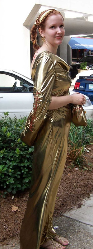 Also, after wearing this gown to the convention Friday night and Saturday morning for the parade, I took it home and discovered that the underarms had been irrevocably damaged from my sweat! The gold overlayer had worn down, and the black showed through, looking like a “stain.” It’s not horribly noticeable, but I intend to wear underarm shields whenever I wear the gown again. Also, the gold fabric can get runs and pulls in it, like stockings. Overall, this fabric is horrible. It’s perfect for the look of the gown, but it does NOT wear well.