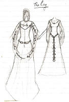 The actual body of the gown was extremely simple to create. Christine did a muslin of the shape, and we cut out the back to just the right shape to ensure that it would show my back, but also not show my bra straps. The fabric is very slinky, so we ended up putting snaps on the inside of the gown on the shoulders, and matching snaps on my bra, to make sure that the bra did not show under the dress. The sleeves we also made a muslin of, experimenting with where we wanted the tube to rest in the back. When we were satisfied, the actual sleeves were made, and embroidered (digitally) with the Tengwar script. The tube has two slits in it for my arms, and then is solid everywhere else. The tube was stuffed with cotton batting.