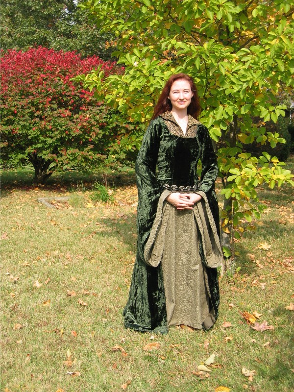 Eowyn Green GownI made the green gown by using the dress pattern of Simplicity 9891and then using the view B sleeves from Butterick 3552. This was my first attempt at modifying patterns, and while the process was not flawless, it went pretty well. I cut the pattern to make the front dip down (which it does, but not that much) and the same in the back. The sleeves I shortened, as in the pattern they go all the way to the floor. I had wanted to use stretch velvet, but my purse strings were already stretched to the limit, so when I got fabric samples from Denver Fabrics and Baer Fabrics, I ended up going with cotton velvet, but the color was right on. Also, the helpful person I had spoken to on the phone at Baer Fabrics was also a Tolkien fan, knew the dress I wanted to make, and generously sent 12 samples, at no charge.